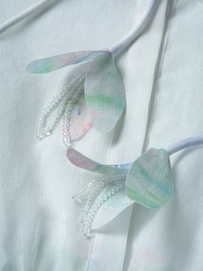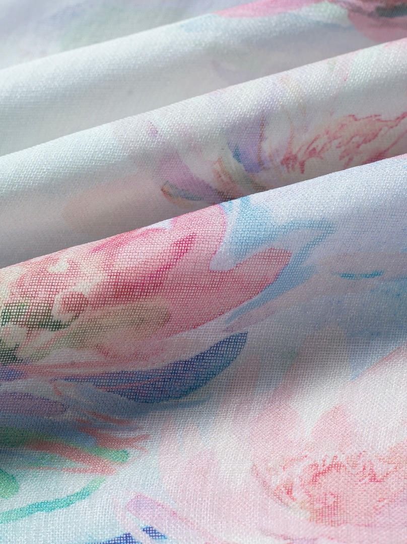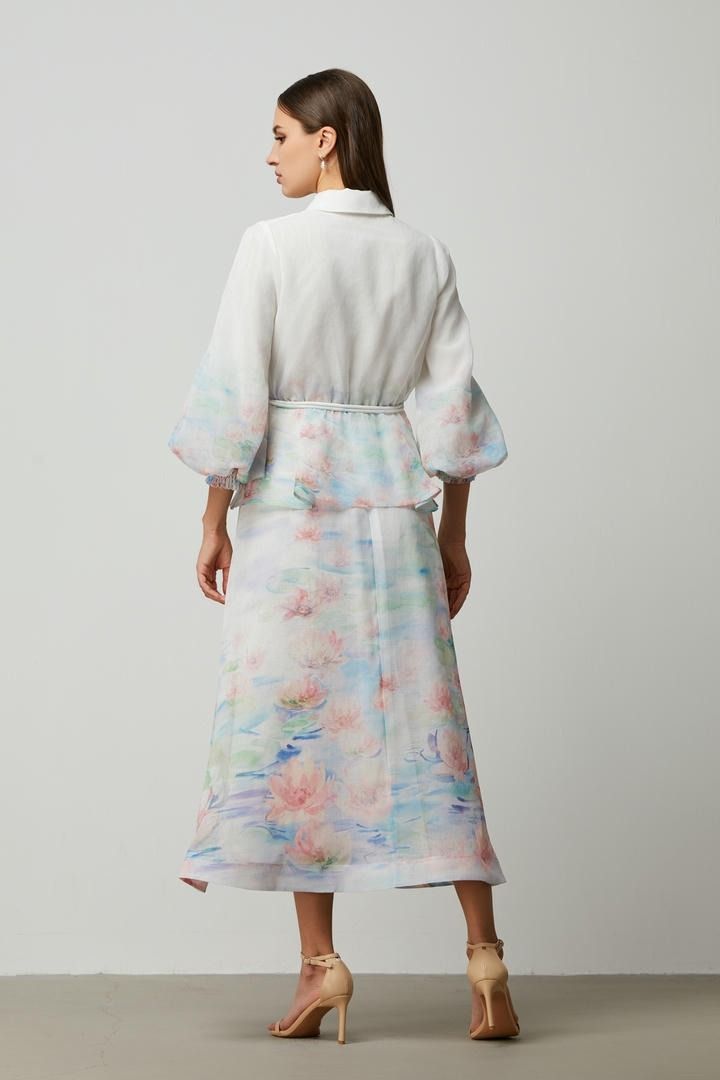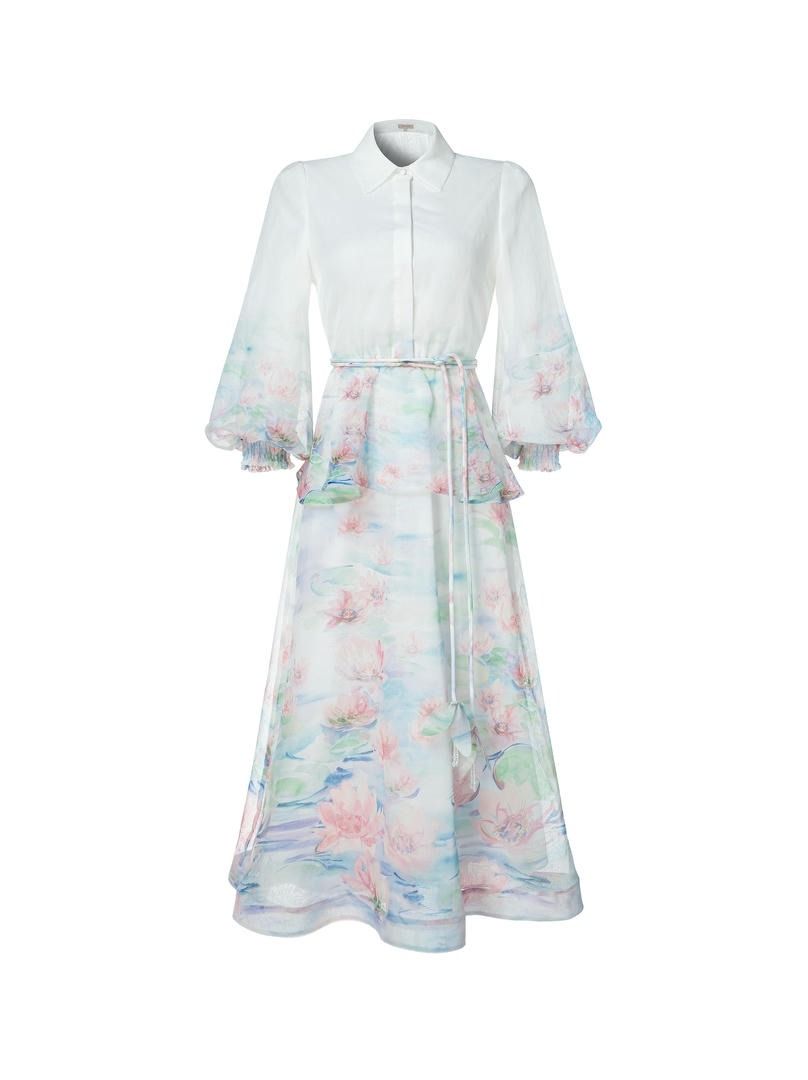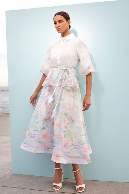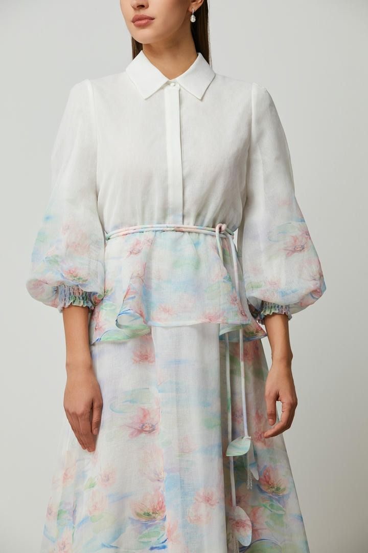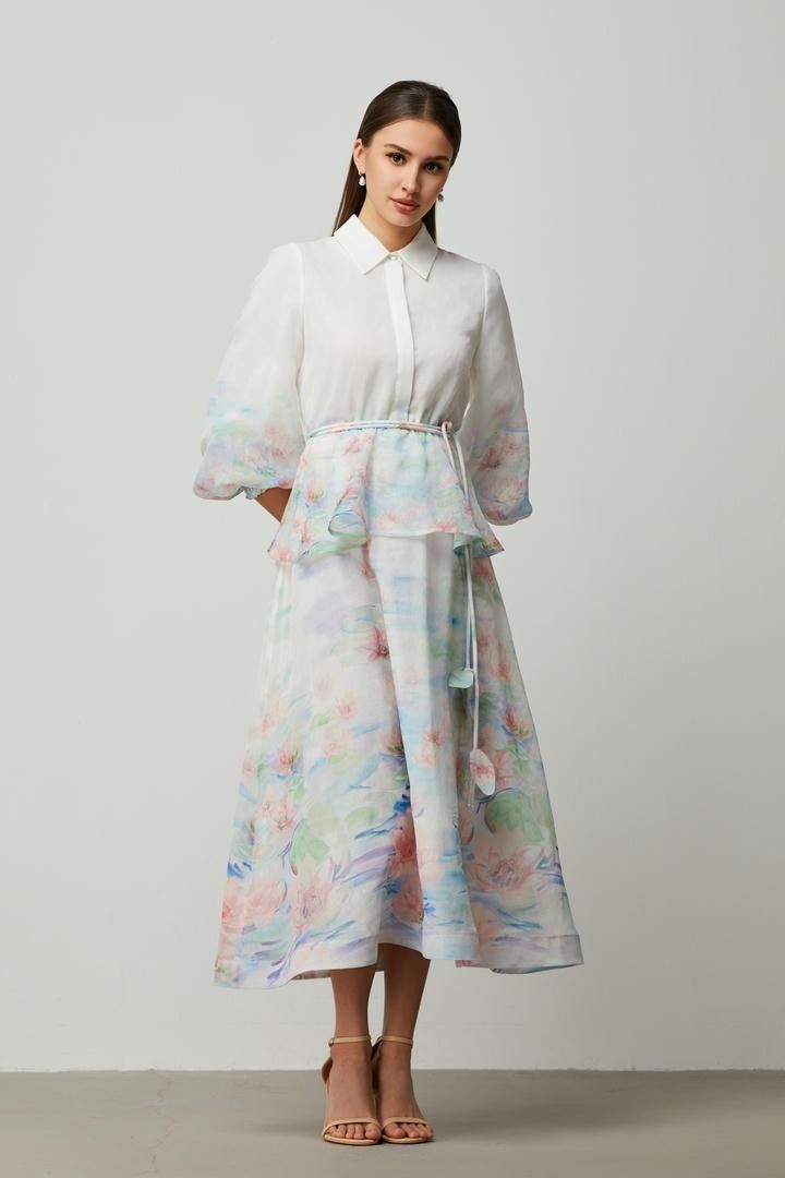 فستان ميدي أنيق من الأورجانزا مزين بطبعات ناعمة باللونين الأبيض والوردي. يتميز بياقة قميص كلاسيكية، وأكمام مميزة، وخصر مطاطي لإطلالة أنثوية جذابة. يضيف الحزام المصنوع من نفس القماش لمسة من الأناقة العصرية على القصة الواسعة. مثالي لإطلالة راقية ومفعمة بالأنوثة.