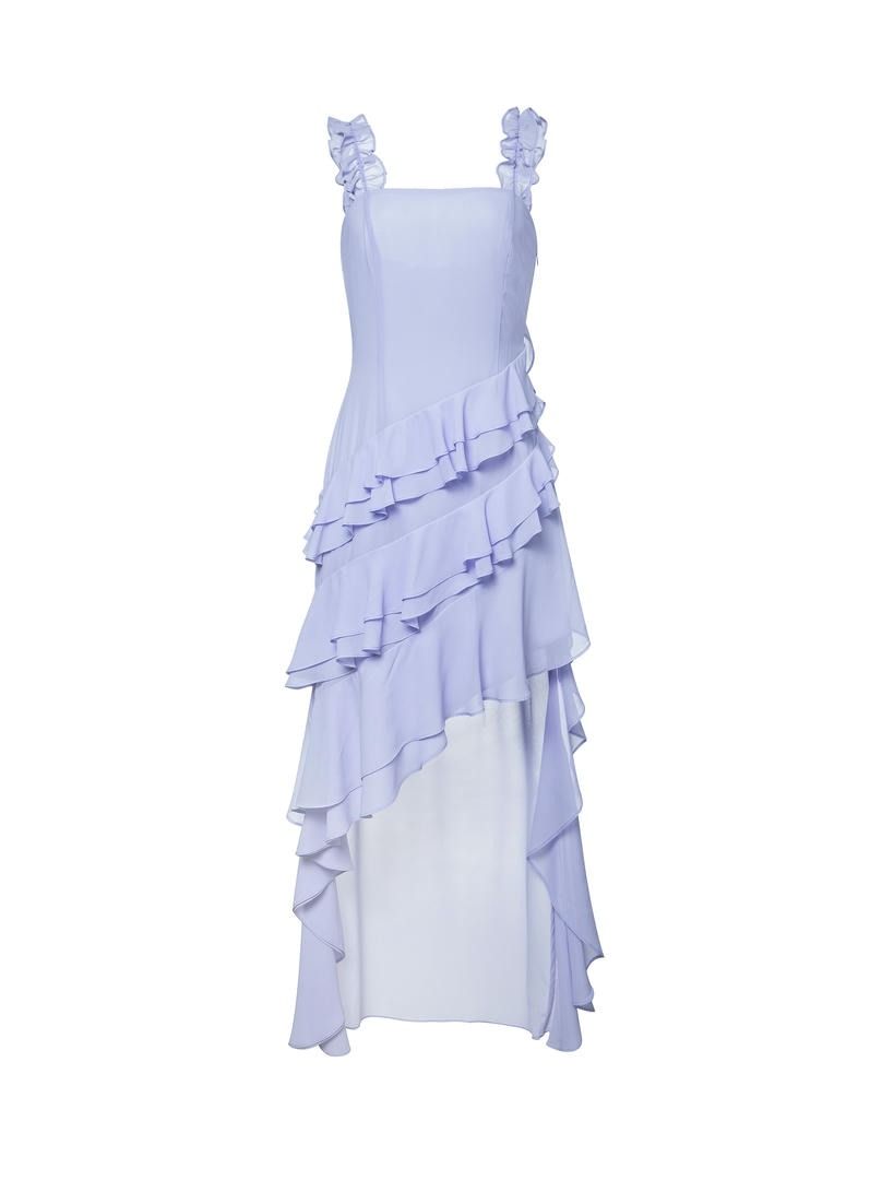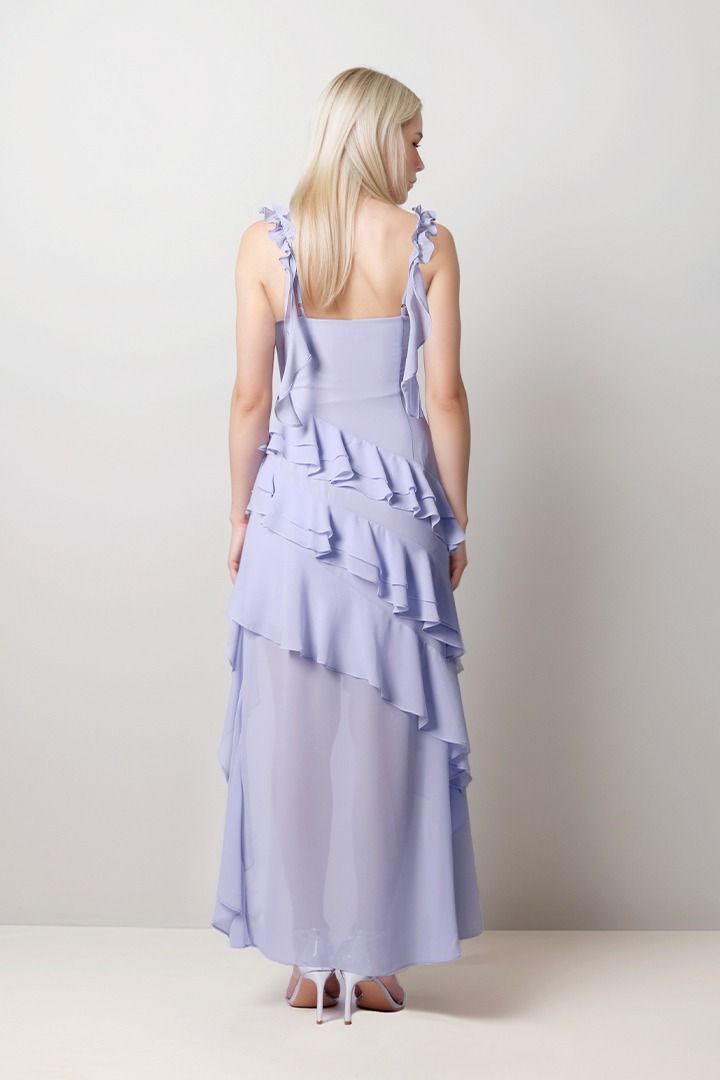فستان شيفون بلون اللافندر بتصميم أنيق يتميز بحمالات كتف مزينة بالكشكش وتفاصيل كشكش مائلة تمنحه لمسة أنثوية ساحرة. يأتي بقصة ضيقة تبرز القوام، مع بطرف غير متساوية تضفي انسيابية ورقيًا. مثالي لإطلالة راقية وجذابة.