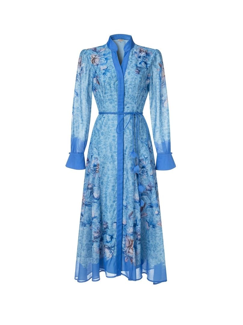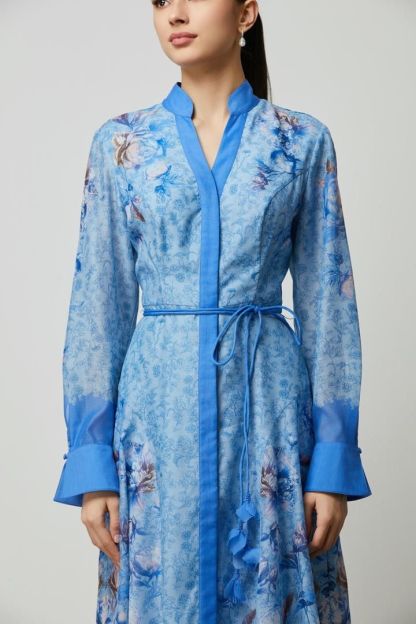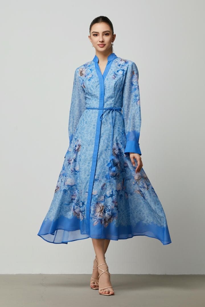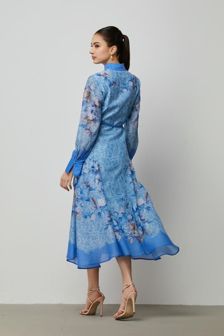 فستان قميص أنيق ومريح بطبعة جميلة باللون الأزرق. يتميز بياقة واقفة، وأزرار أمامية، وحزام مزين يبرز الخصر. مصنوع من قماش الكريب الناعم لإطلالة أنيقة وعملية.