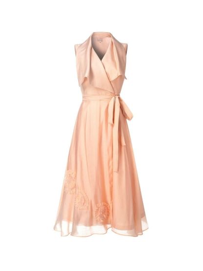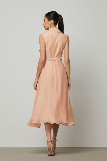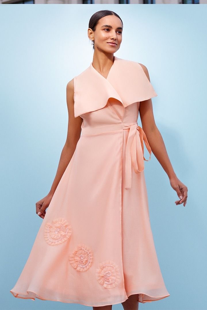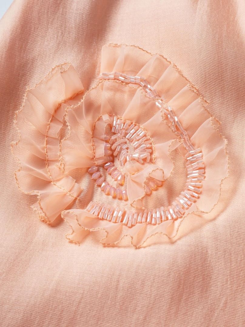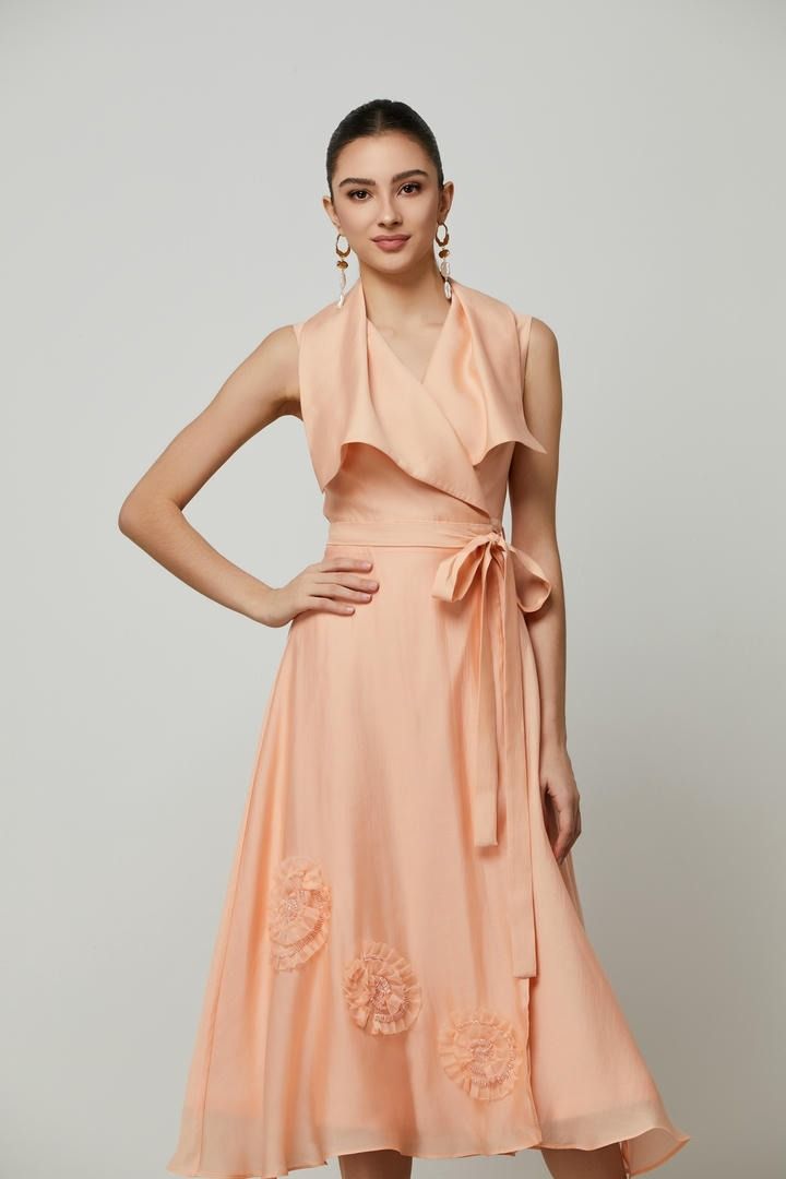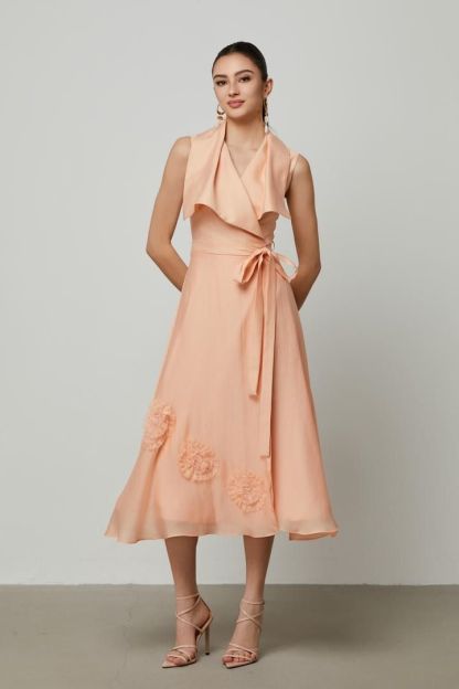 يتميز هذا الفستان بياقة متدلية على شكل V وقصة ملتفة تعزز القوام. يضيف التطريز الفاخر عند الحافة لمسة ساحرة، مما يجعله مثالياً لإطلالة راقية.
