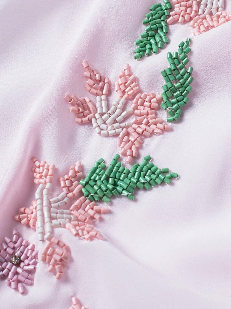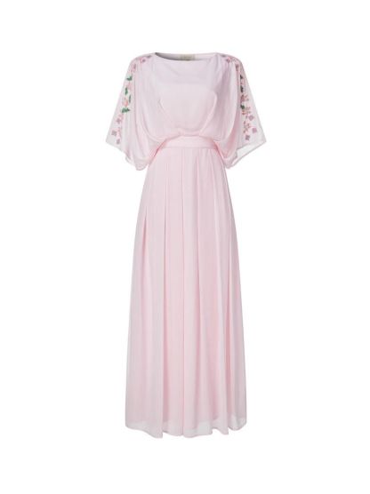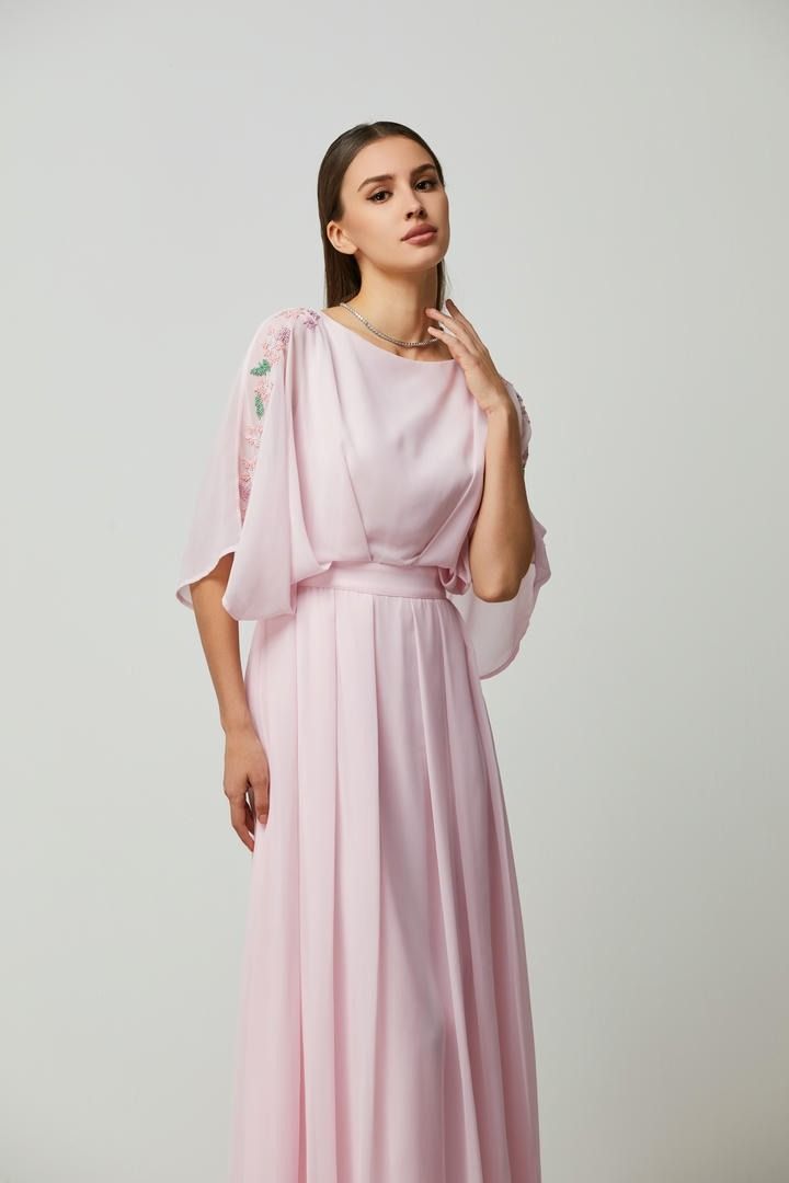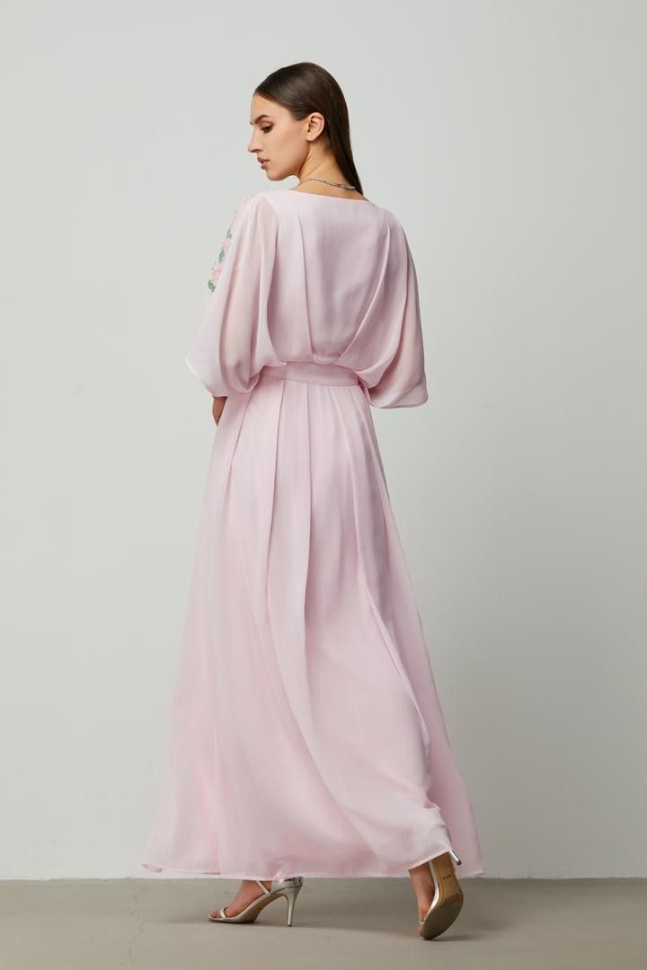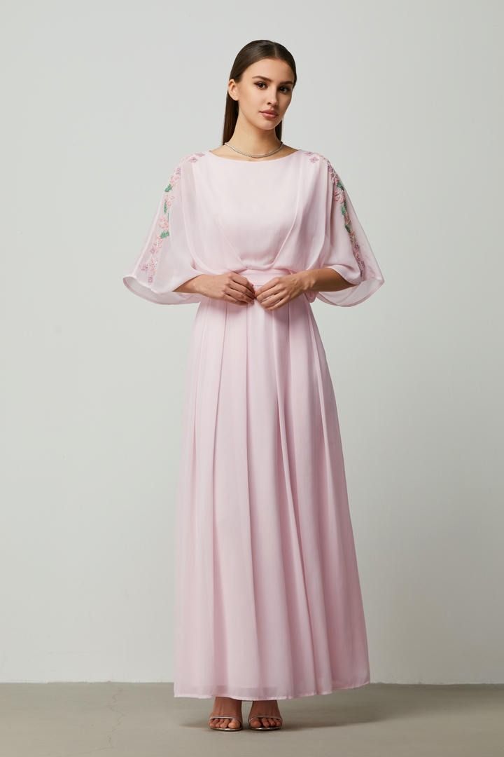 هذا الفستان من الشيفون والمزين بالتفاصيل الرائعة. يتميز بتصميم ياقة البوت الراقي، وزخارف متعددة الألوان على الأكمام، بالإضافة إلى طيات دقيقة حول الجسم. هذا الفستان الطويل مثالي لإطلالة ساحرة في أي مناسبة خاصة.