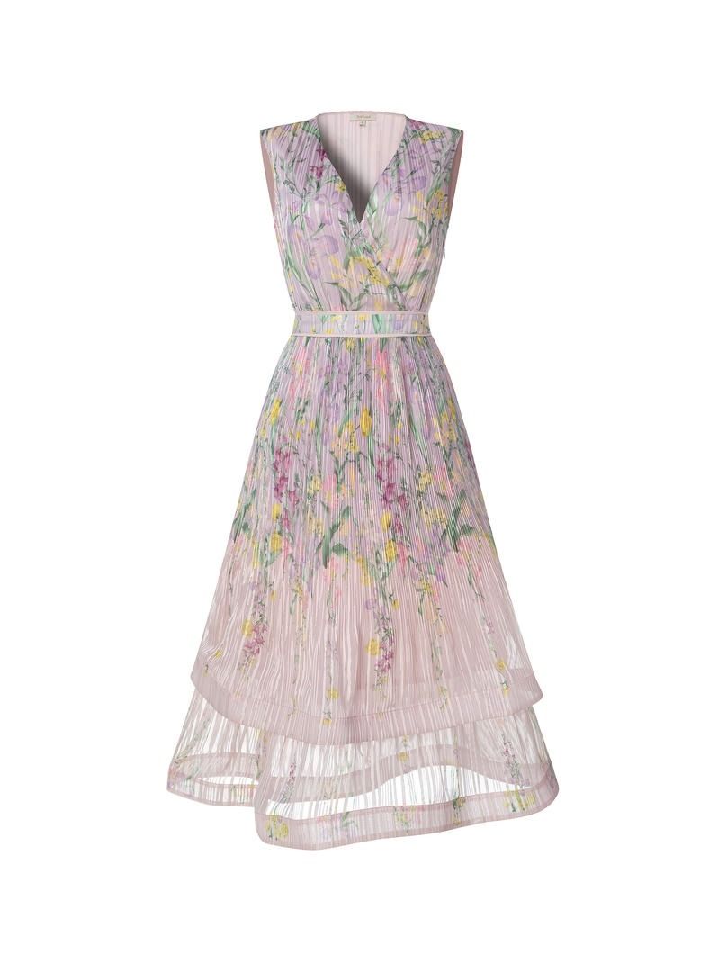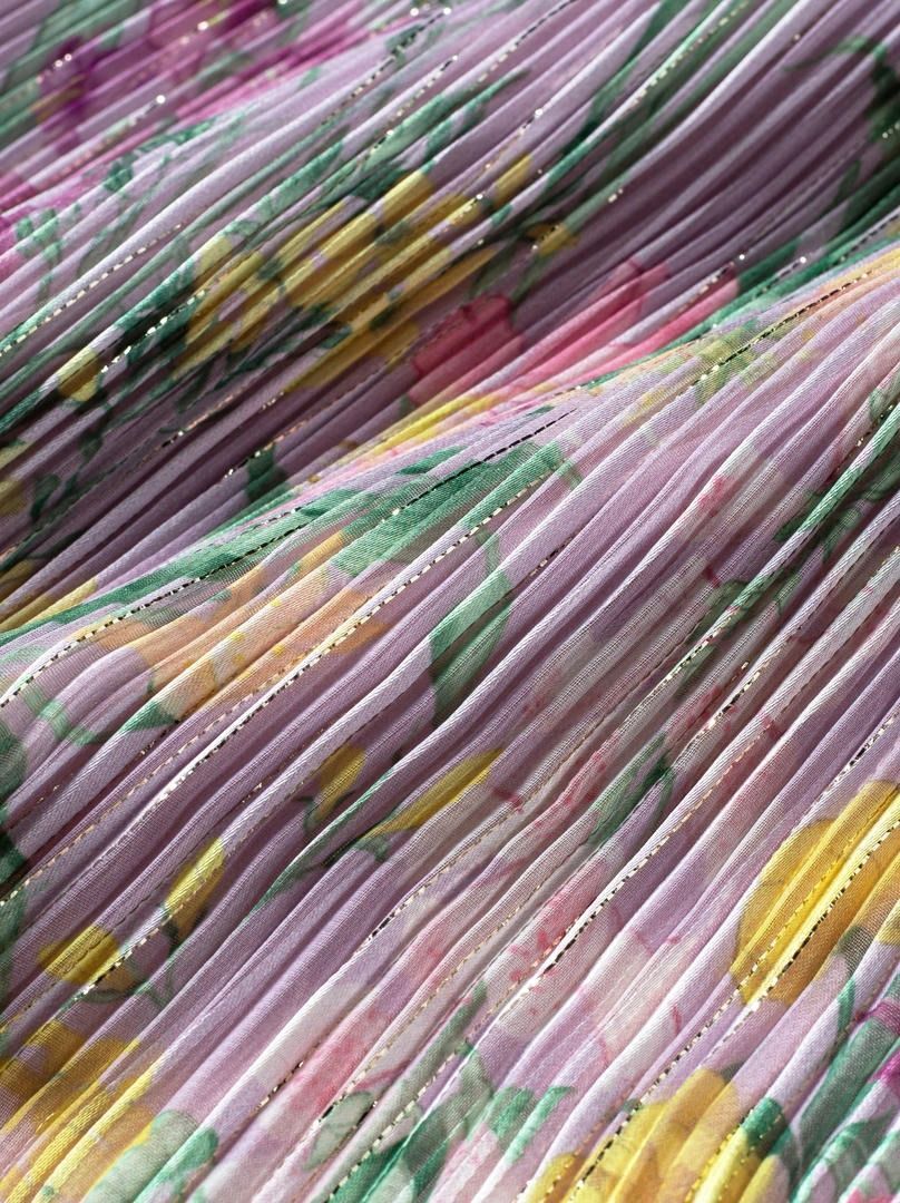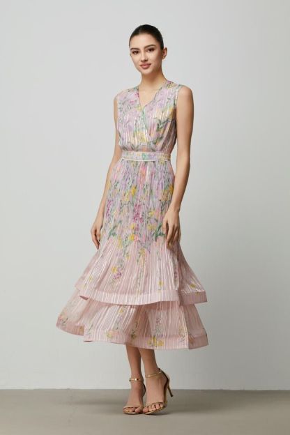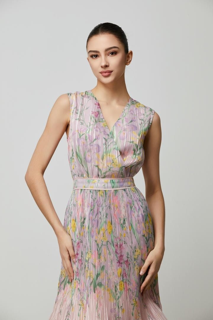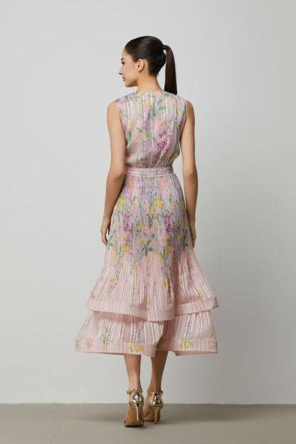 استمتعي بالأناقة مع هذا الفستان الميدي المطبوع بتصميم خطوط من الشيفون ومزيج من اللونين البنفسجي والوردي. يتميز الفستان بتصميم ياقة متداخلة وبدون أكمان، مع حزام من نفس القماش يبرز إطلالتك بإتقان. التنورة المطوية من طبقتين تضيف حجماً وحركة، مما يجعله مثاليًا لأي مناسبة خاصة.