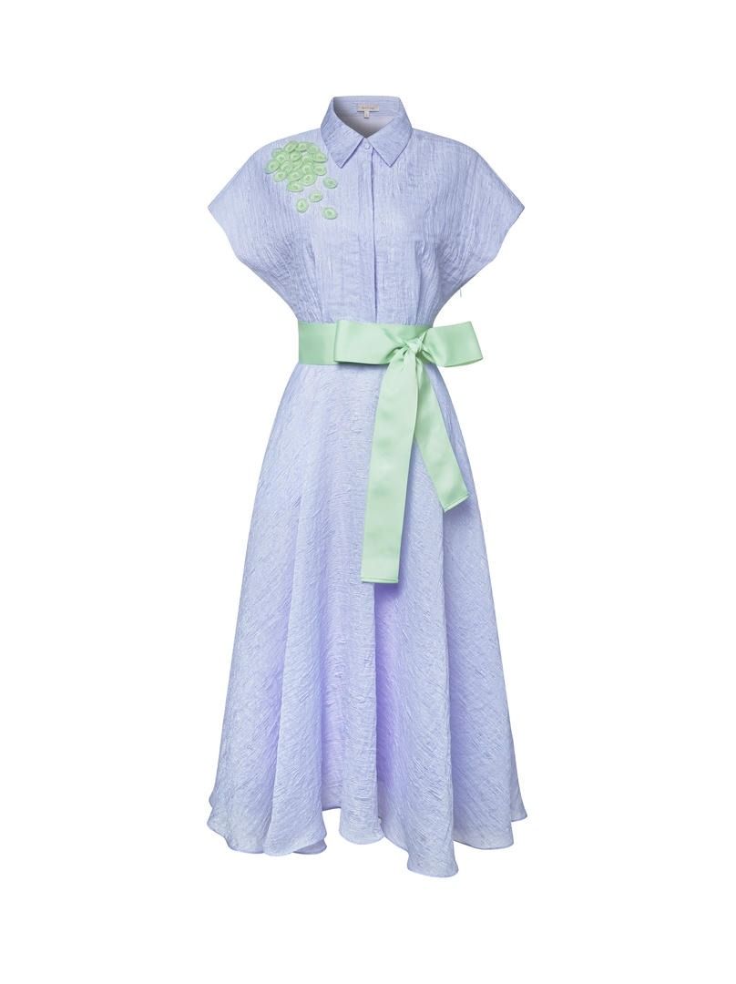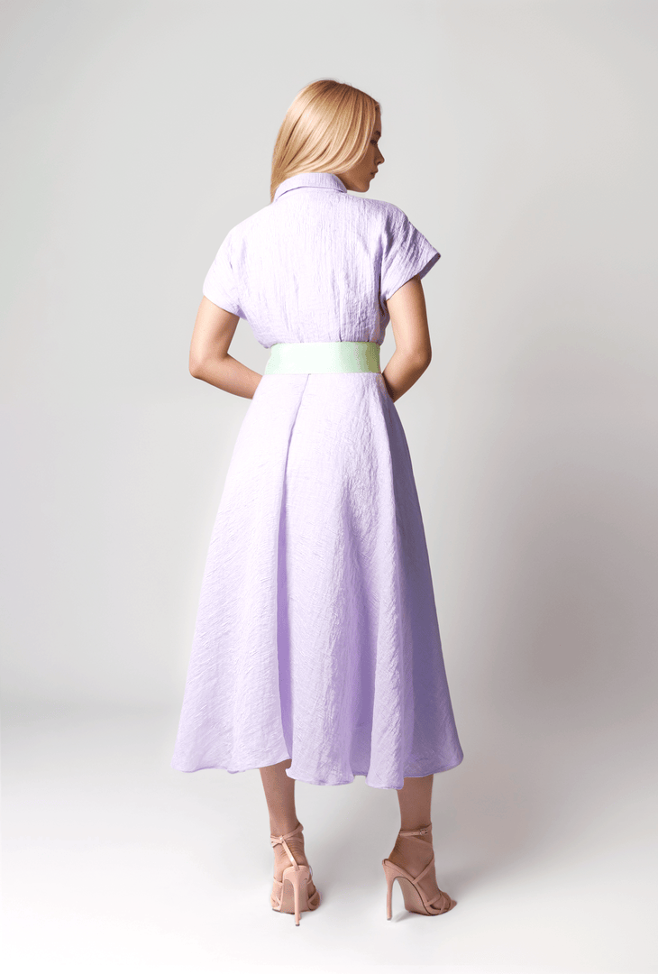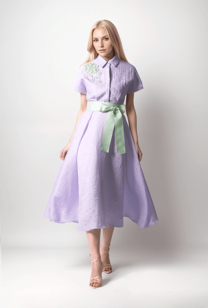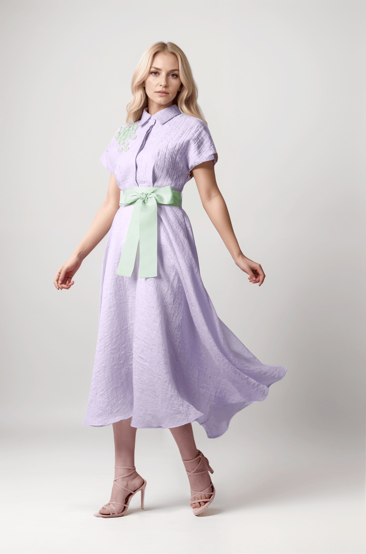 فستان ميدي أنيق بحزام متباين من قماش جاكارد وأزرار في الأمام. يتميز بقصّة عند الخصر ومزين متباينة على الكتف وأكمام قصيرة. مثالي للمناسبات العادية أو شبه الرسمية.