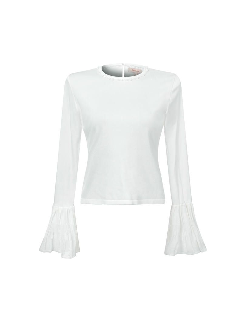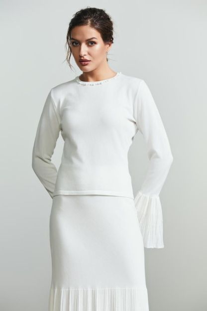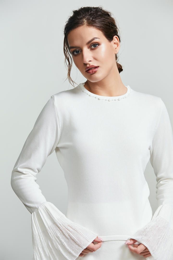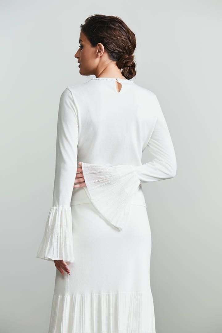 تصميم بفتحة رقبة مستديرة مع زينة حول الرقبة وأكمام طويلة مع أساور واسعة وقصة ضيقة. يمكنك تنسيقه مع تنورة مماثلة.