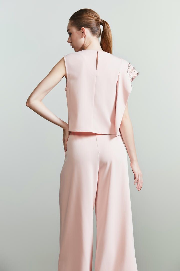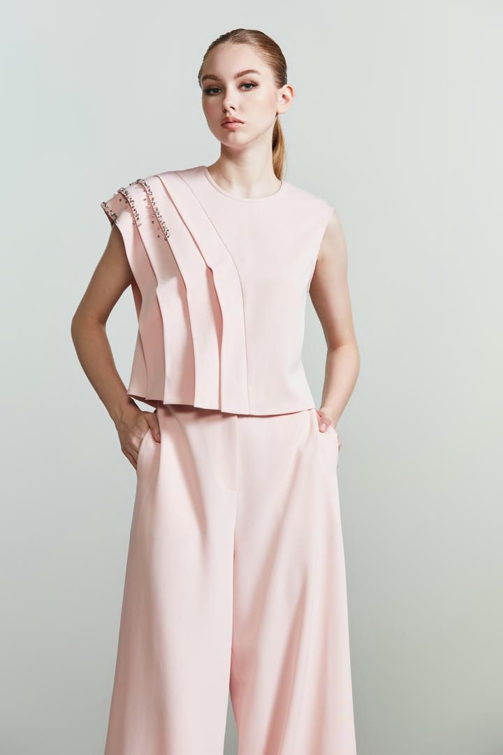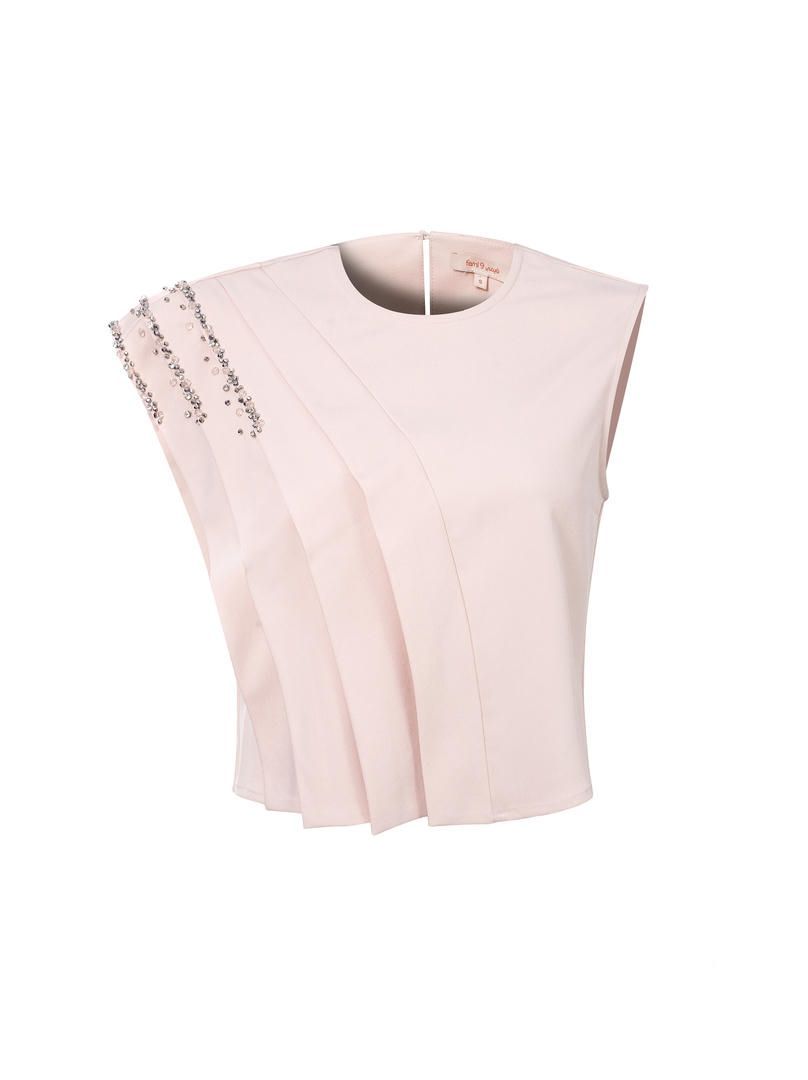 إطلالة أنيقة مزينة بزخرفية على الطبقات المتدرجة على طول التصميم. بلوزة مصممة بفتحة عنق دائرية ومن دون أكمام.