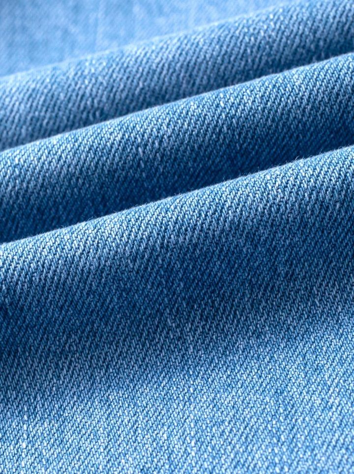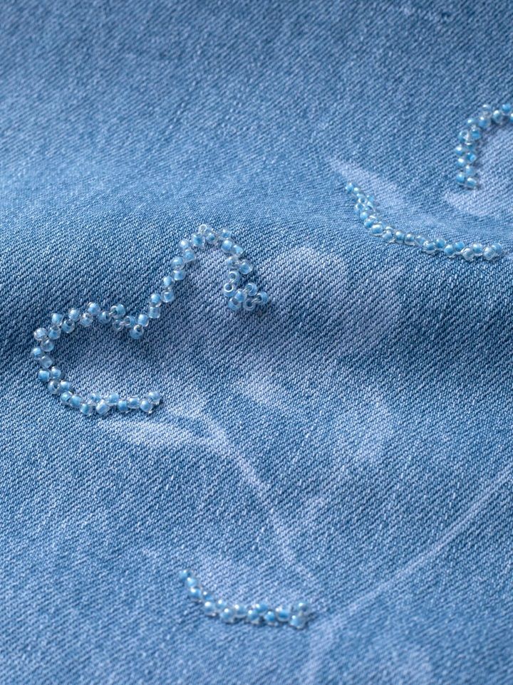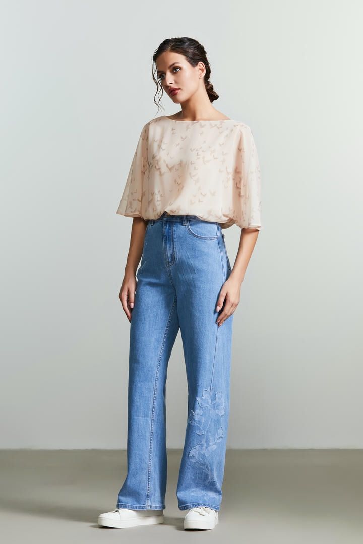 هذه البنطال من قماش الدنيم ذات الخصر المرتفع، مع قصة مستقيمة جذابة وتطريزات خرزيه مذهلة مع طبعات