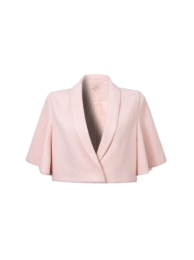جاكيت تصميم كيب قصيرة بفتحة رقبة ياقة وأكمام قصيرة واسعة لسهولة الحركة مع تفاصيل مطوية في الخلف