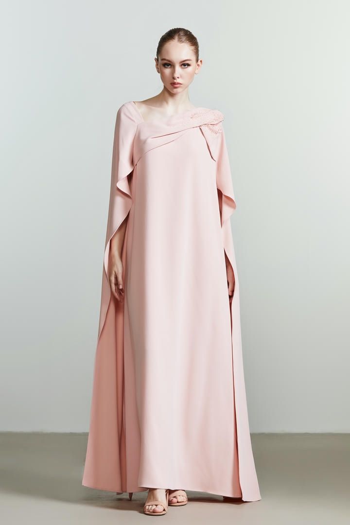 يتميز الجزء الخلفي من كاب مزين بزهرة ثلاثية الأبعاد وخرز مع فتحة رقبة غير متماثلة. فستان طويل مزين بالزهور