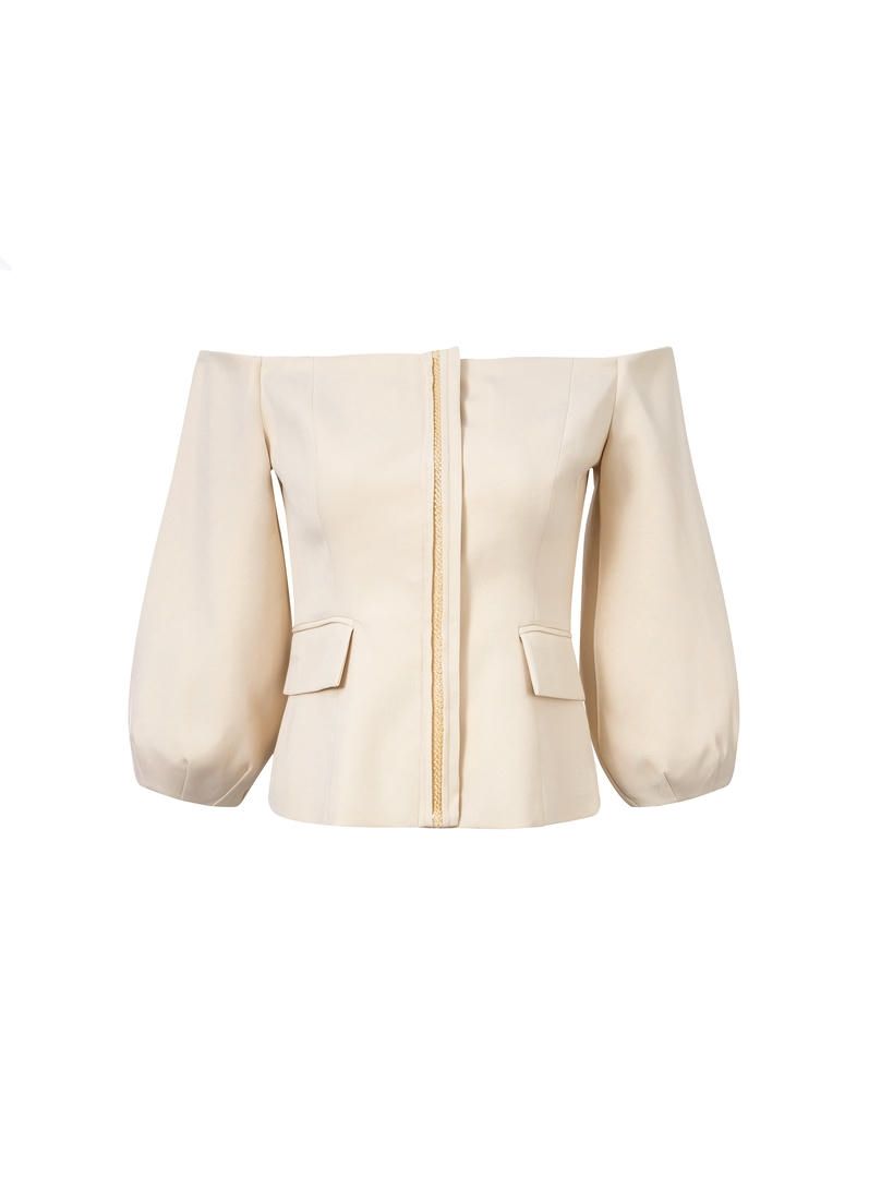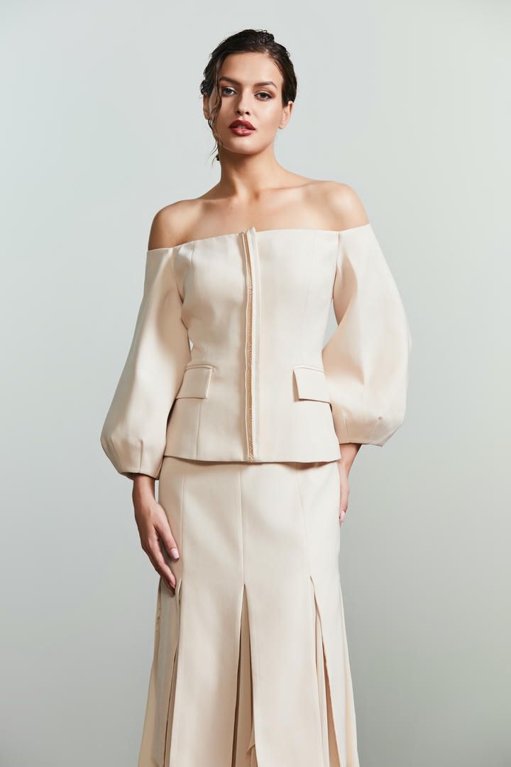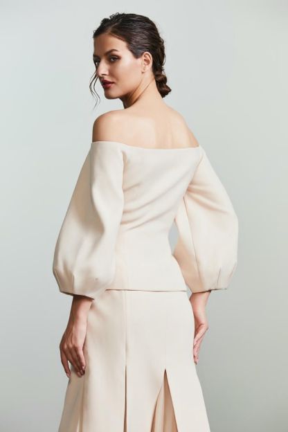 إطلالة رسمية وأنثوية في نفس الوقت مع هذه البلوزة المكشوفة الأكتاف ذات الأكمام الطويلة المنتفخة مع أساور مطاطية. خط أزرار مخفي في الأمام مع زخرفة وتصميم بقصّة ضيقة