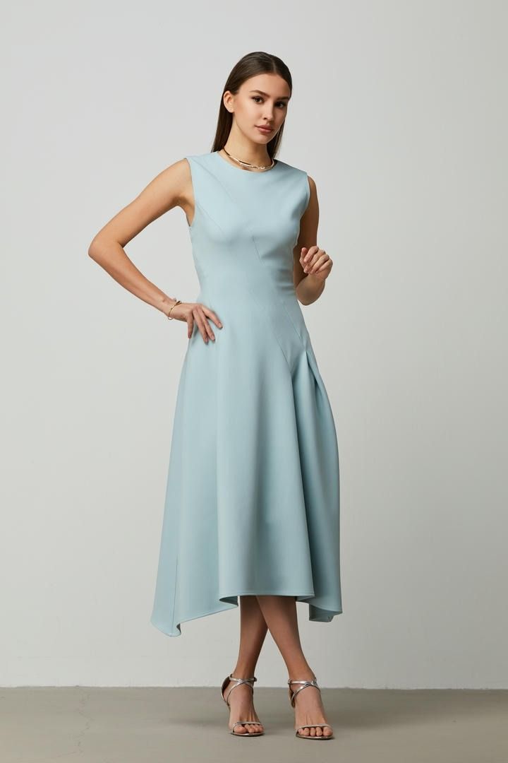 فستان ميدي أنيق بتصميم عصري، يتميز بياقة دائرية، وقصّة ضيّقة، وحافة غير متماثلة لمظهر مميز. تضيف فتحة الدمعة في الخلف لمسة من الرقي.