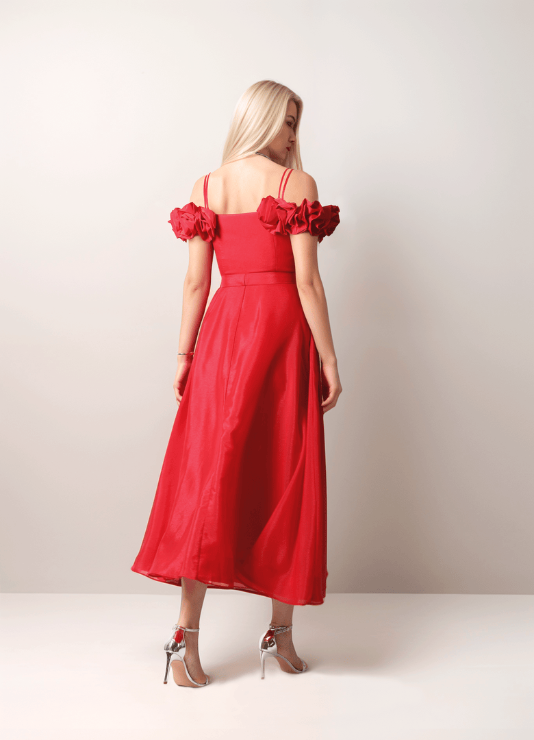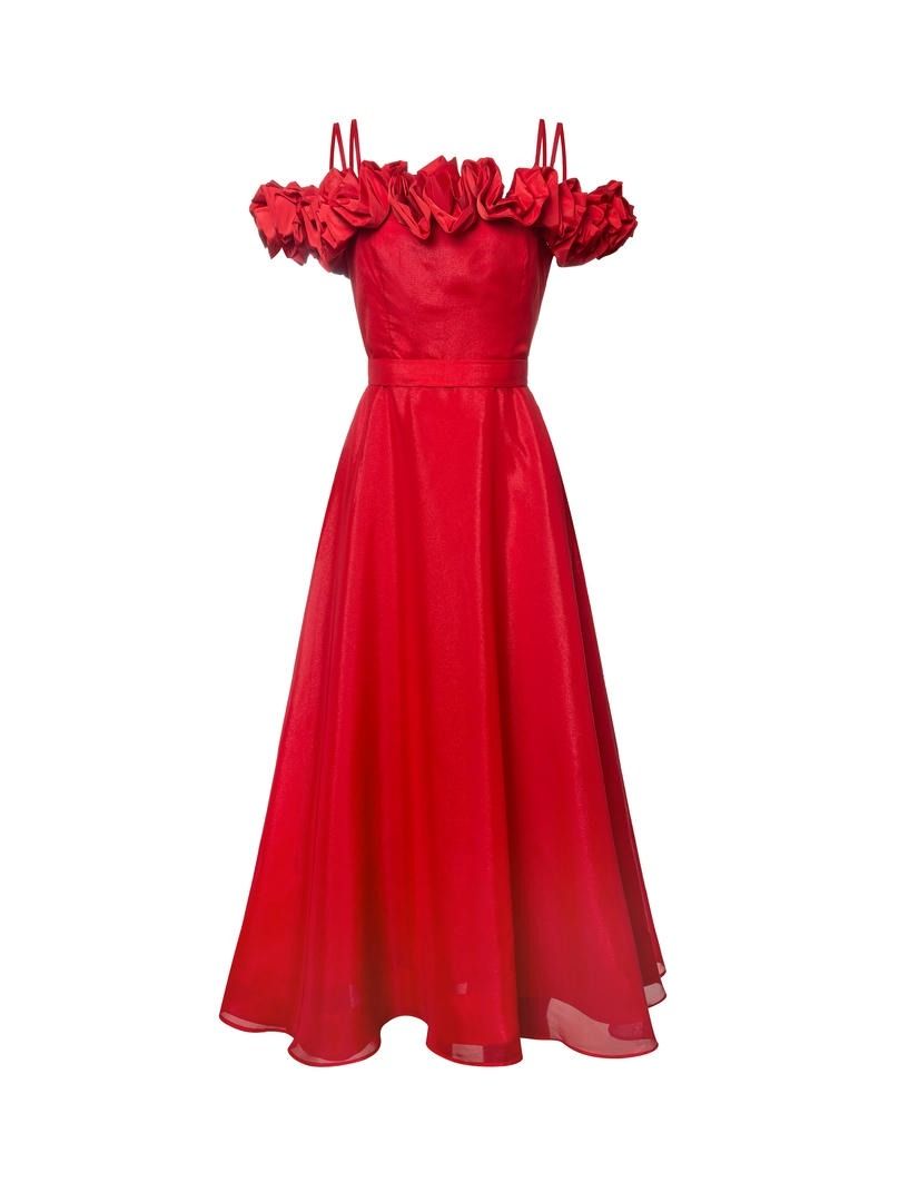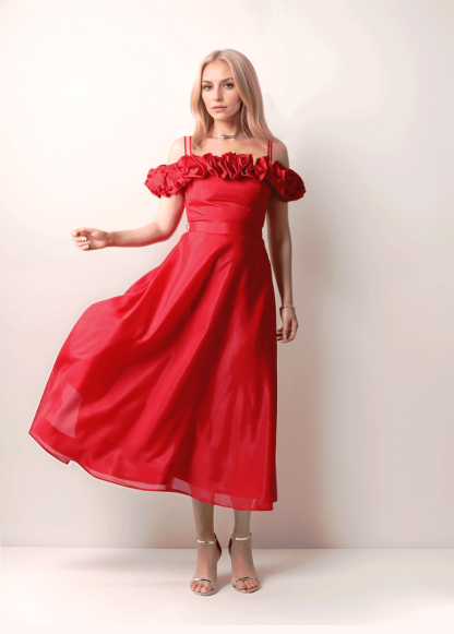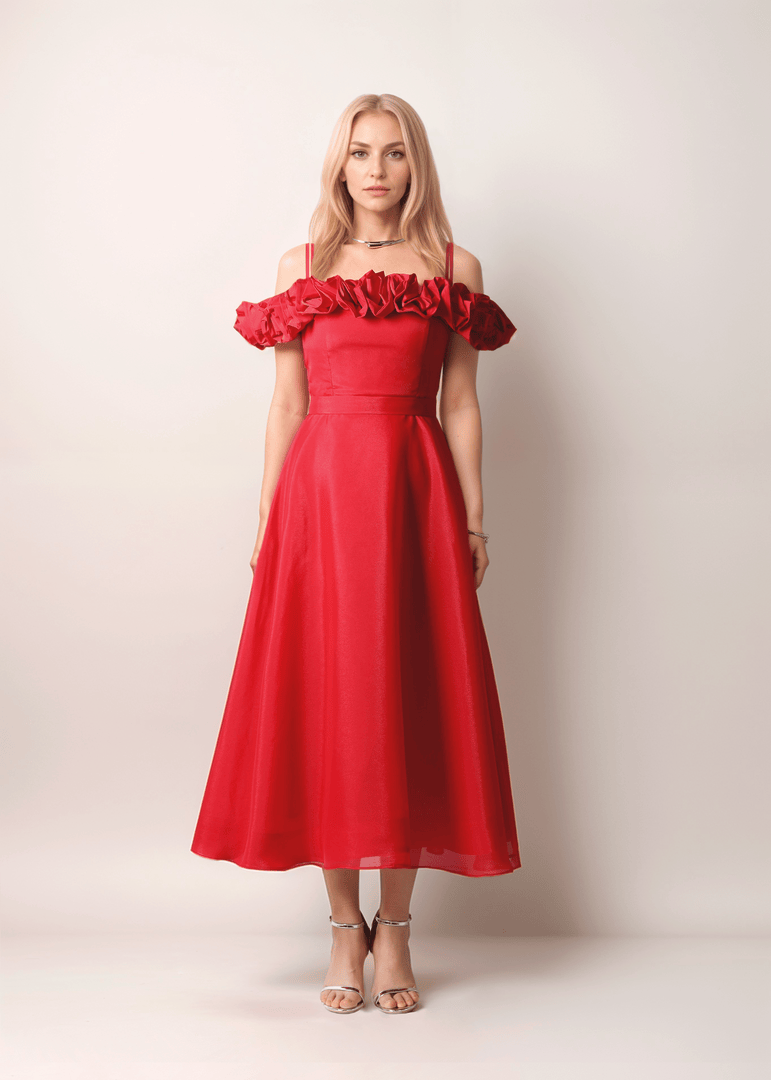 فستان جريء باللون الأحمر بتصميم كتف مكشوف وتفاصيل مكشكشه ثلاثية الأبعاد عند العنق وجسم ضيق. قماش الأورجانزا والحجم الكبير للجزء السفلي يجعله مثاليًا لإطلالة مبهرة.