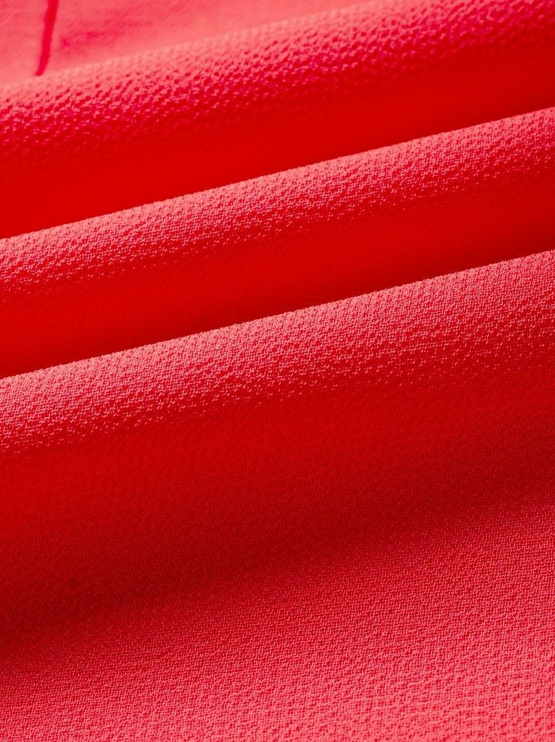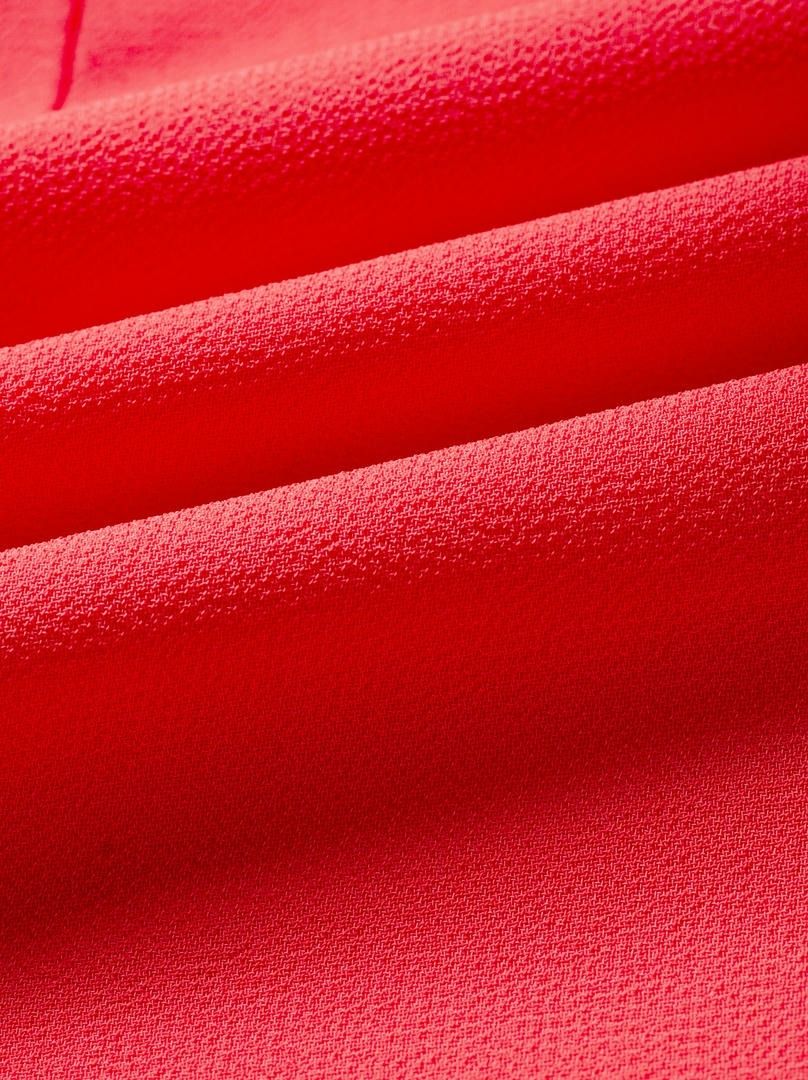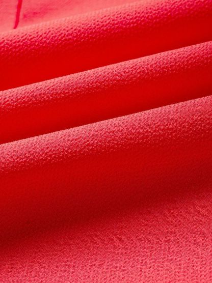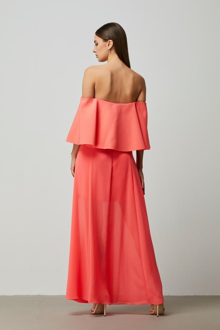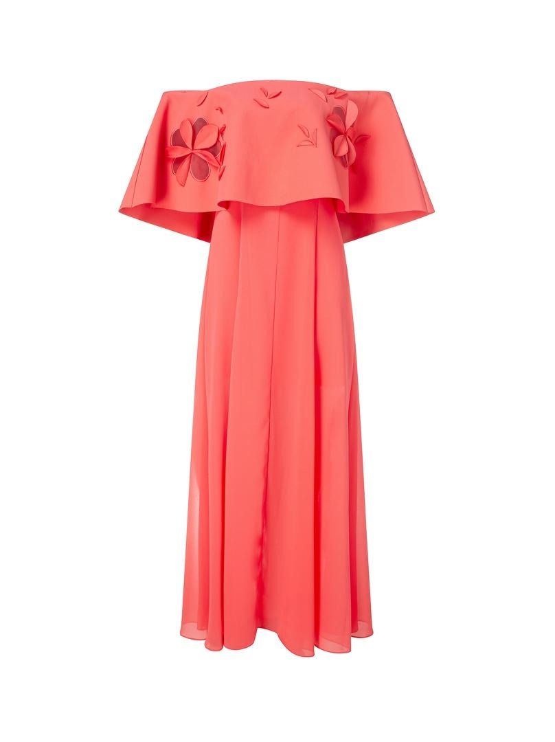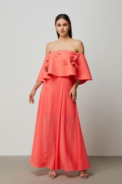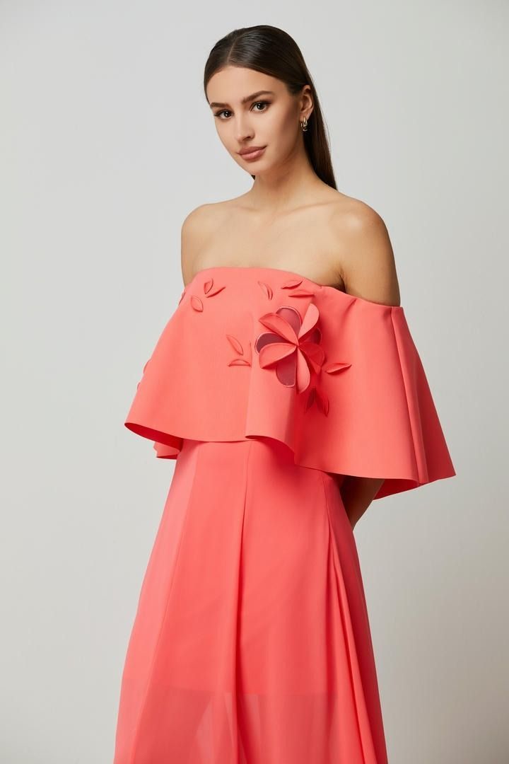فستان بيبلوم بدون أكتاف باللون المرجاني مع تفاصيل زهور وأوراق ثلاثية الأبعاد، وغطاء للجزء العلوي من الجسم، ومزيج من أقمشة الشيفون والكريب. مثالي لإطلالة مبهرة.