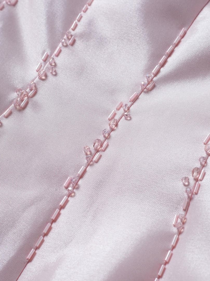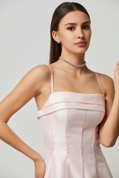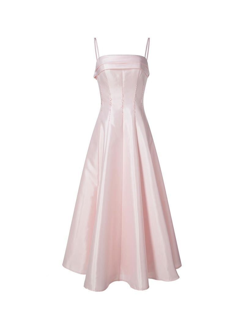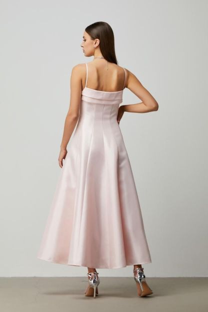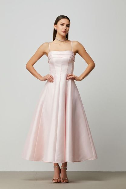 فستان ميدي جميل من التاقتا الوردي مع حمالات رفيعة وخط عنق مسطح وتفاصيل مزينة عند الخصر. التصميم الضيق للجسم والتنورة الكاملة يجعله مثاليًا لإطلالة أنيقة.