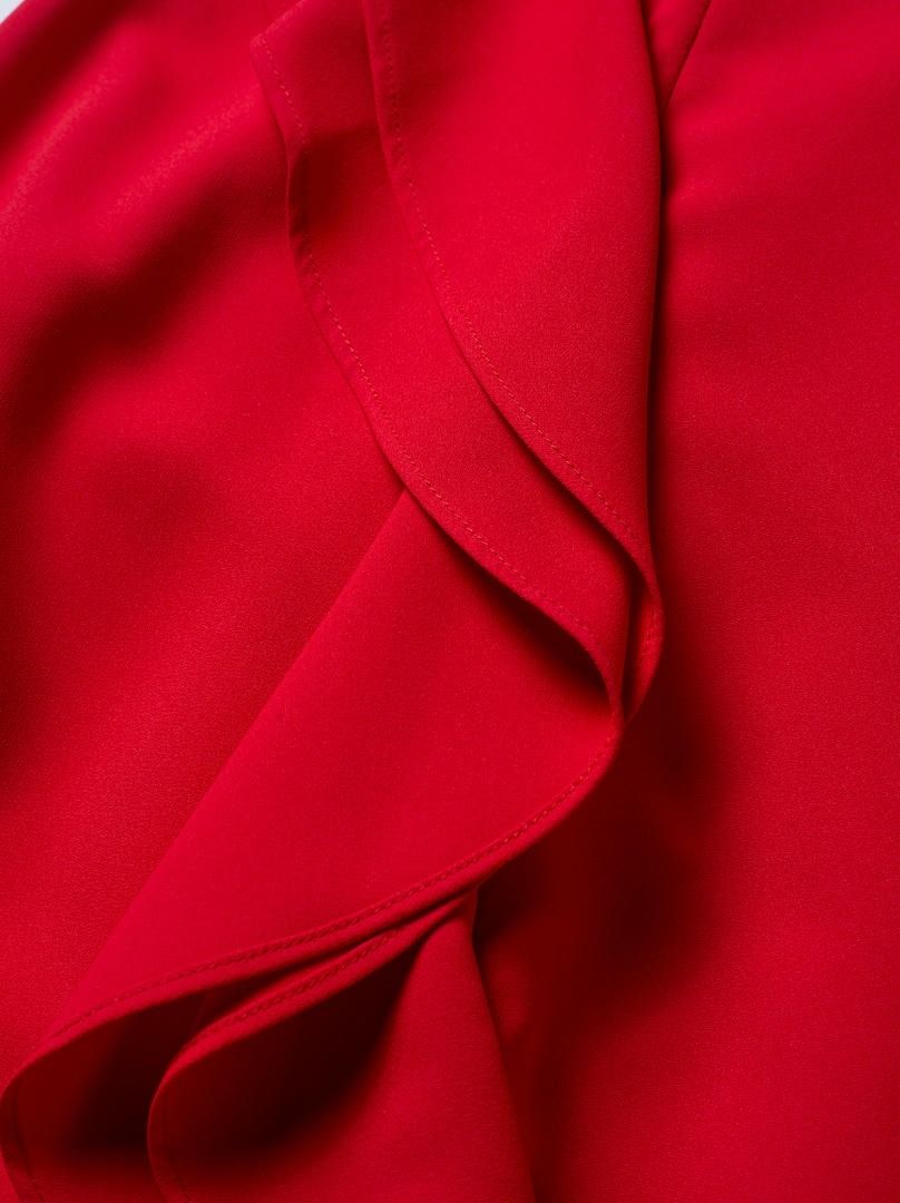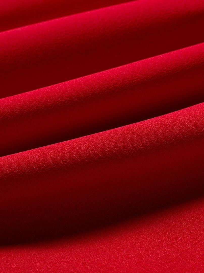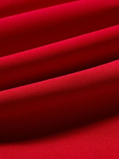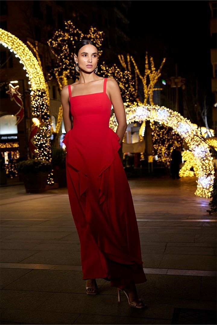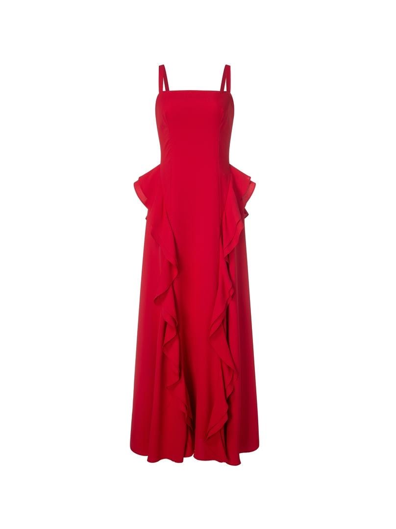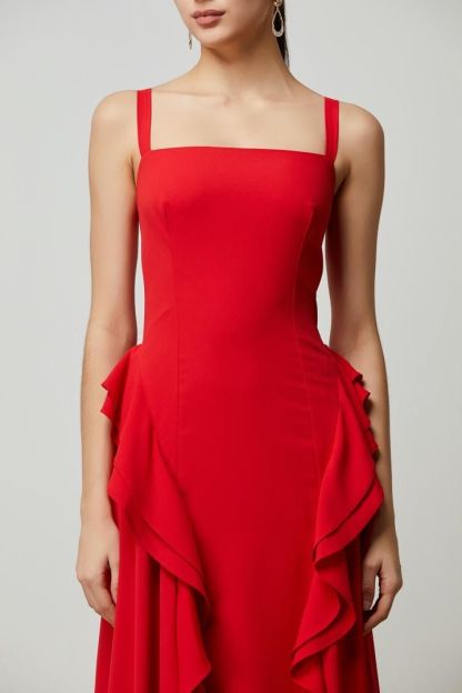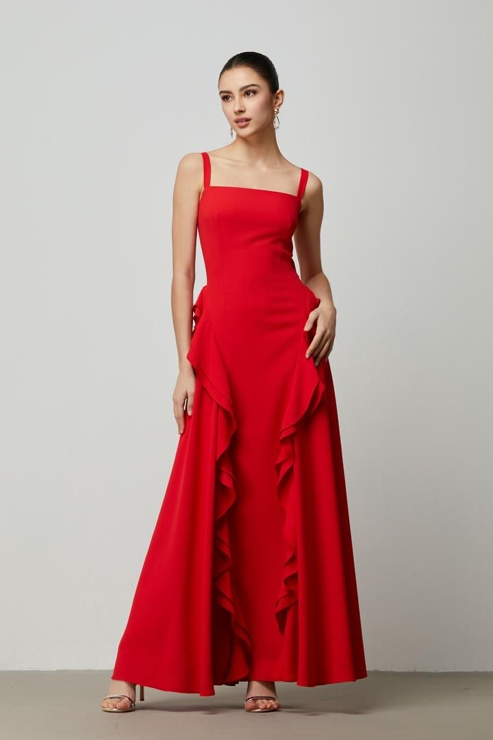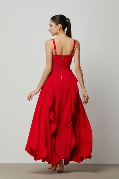 فستان ماكسي جريء باللون الأحمر مع خط عنق مربع وجسم ضيق ومتسع وتفاصيل مكشكشه عند الخصر المنخفض. السحاب المعدني الفضي في الظهر يضيف لمسة عصرية.