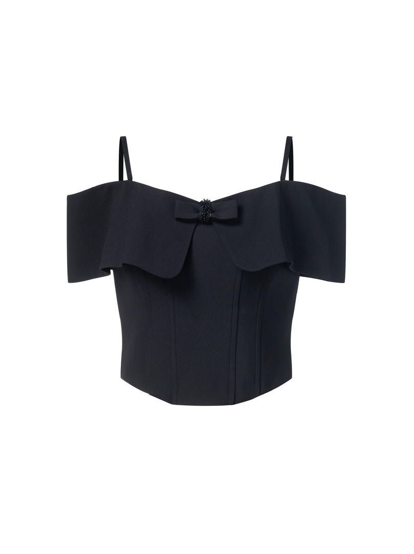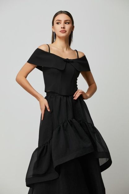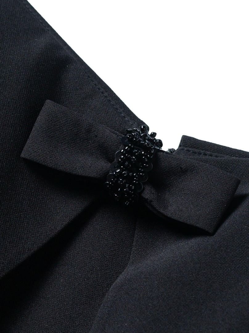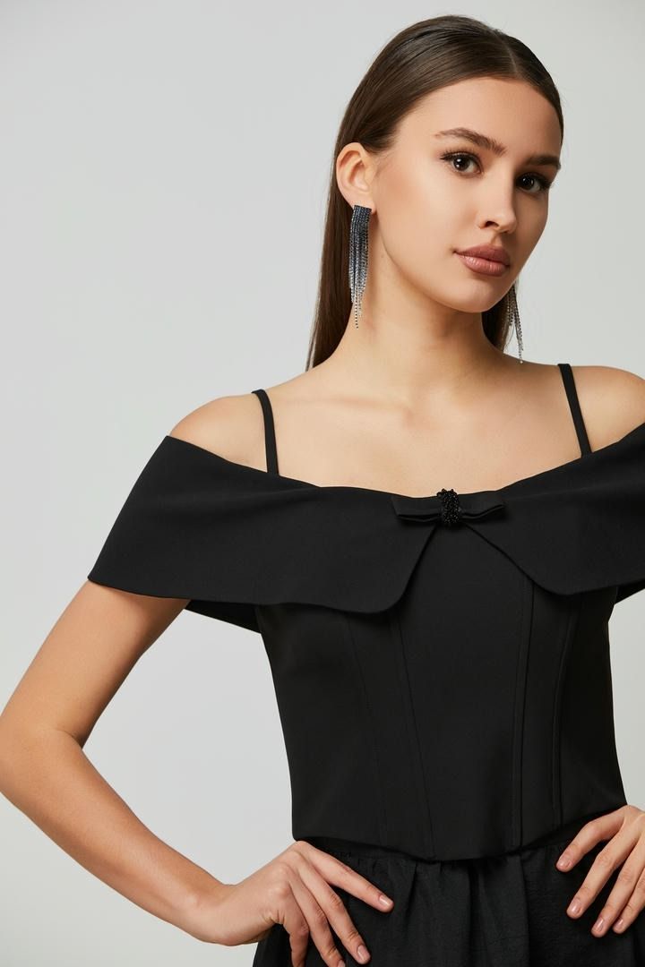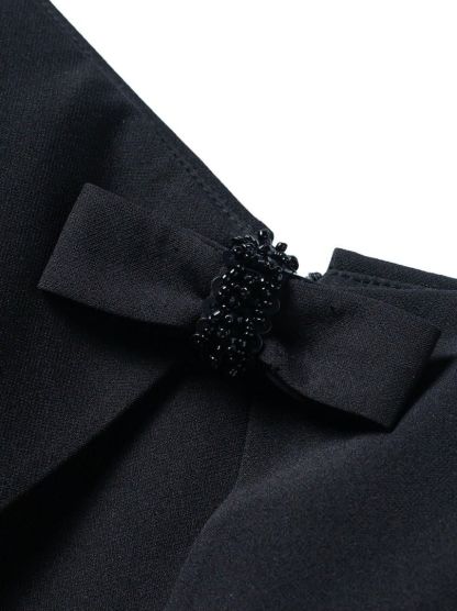 بلوزة أنيق بتصميم مميز مزين بتفاصيل خرز على شكل بفيونكات في الأمام. يتميز بأكمام قصيرة وسحاب في منتصف الظهر لسهولة الارتداء. يمكن تنسيقه مع تنورة من المجموعة للحصول على إطلالة متكاملة.