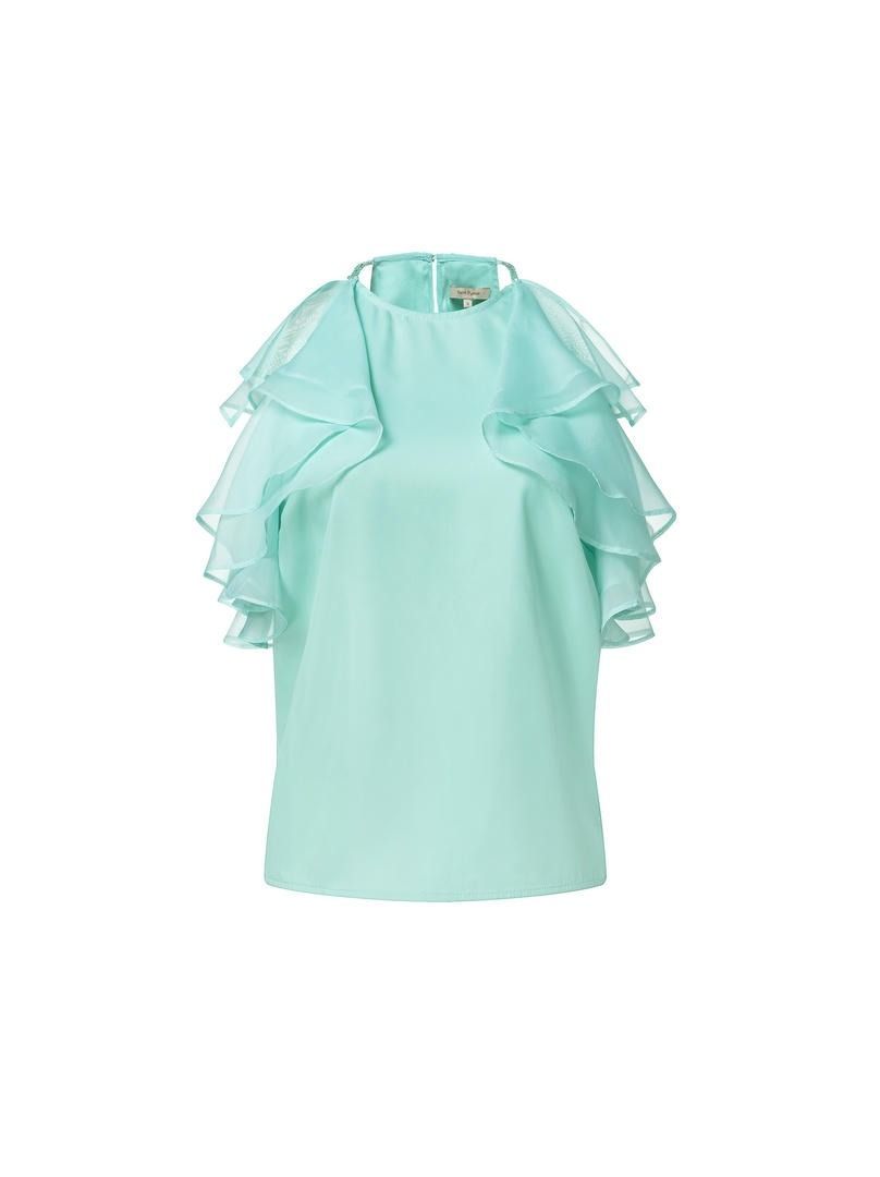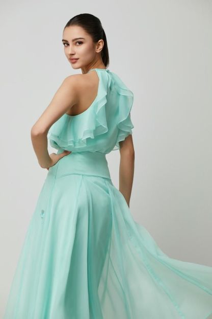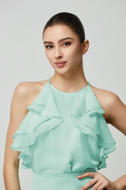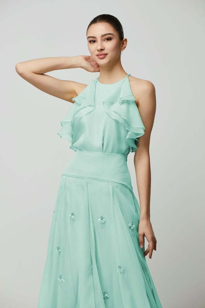بلوزة خضراء مكشكشه بتفاصيل أكتاف مكشوفة وفتحة عنق على شكل هالتر. قصتها الفضفاضة تتناسب جيدًا مع تنورة من نفس اللون.