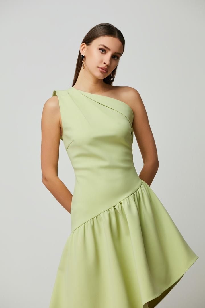 فستان عصري باللون الأخضر الفاتح بتصميم كتف واحد وطية ملفوفة مبالغ فيها وجسم ضيق. التفاصيل المائلة عند الورك تضيف لمسة عصرية، مما يجعله مثاليًا للاحتفالات أنيقة.