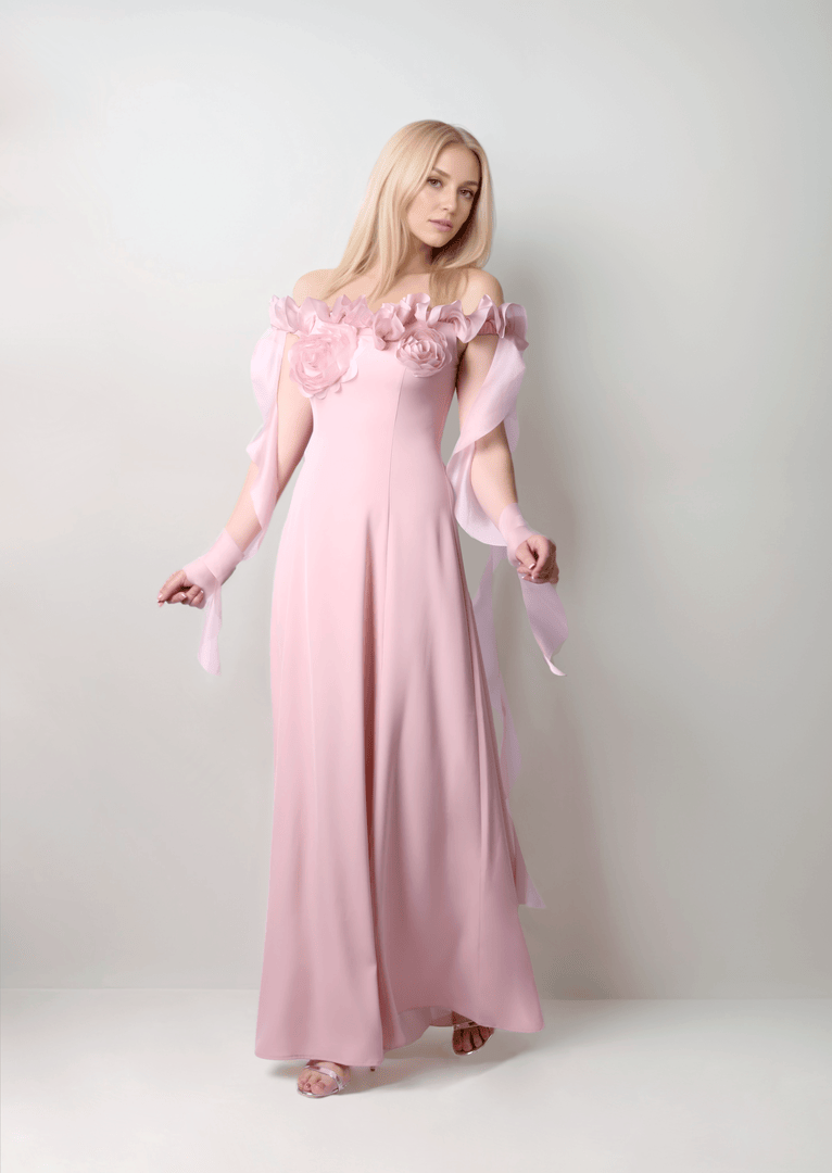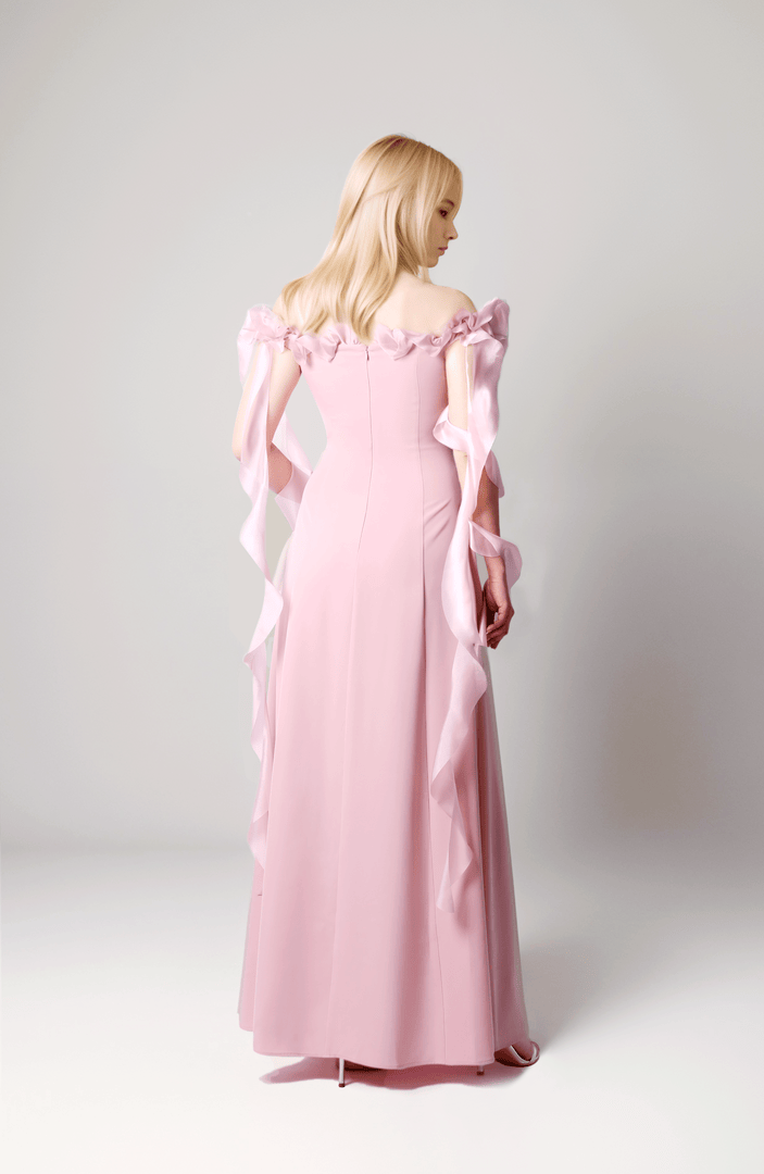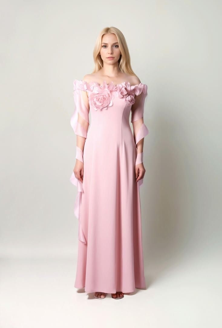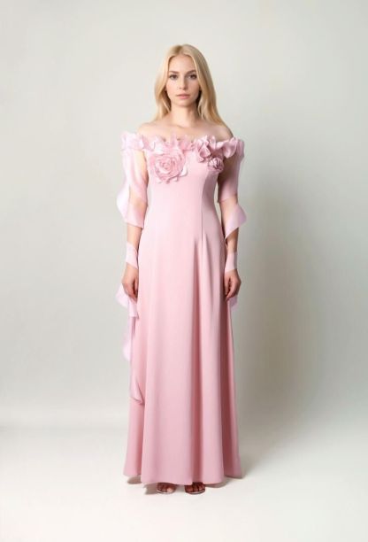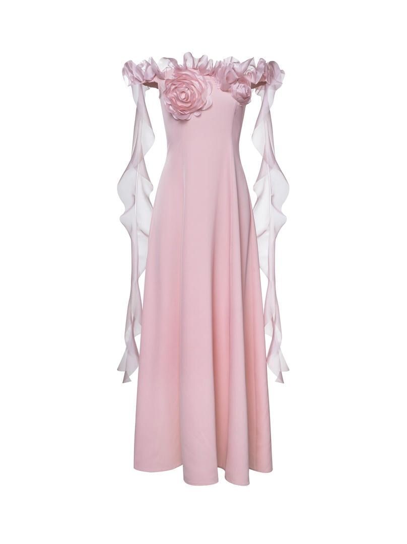 فستان ماكسي وردي بتصميم كتف مكشوف وخط عنق على شكل زهور وجسم ضيق. الجزء السفلي الطويل يضيف لمسة من الأناقة، مما يجعله مثاليًا للاحتفالات