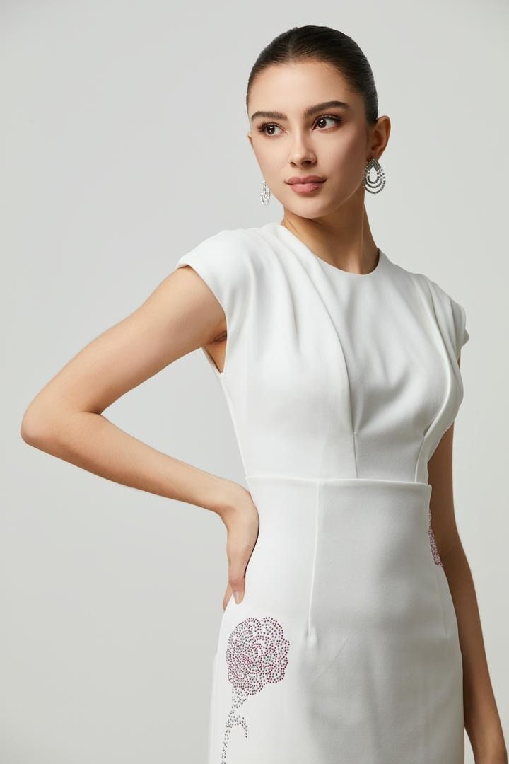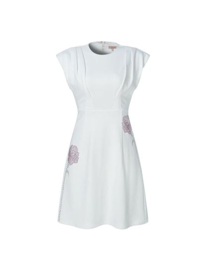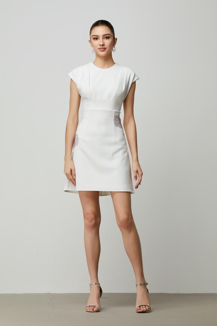 فستان قصير أنيق باللون الأبيض مع أكتاف مميزة فيها وخط عنق دائري وزهور من الترتر في الأمام. الجسم الضيق للتنورة القصيرة يجعله مثاليًا لإطلالة عيد عصرية.
