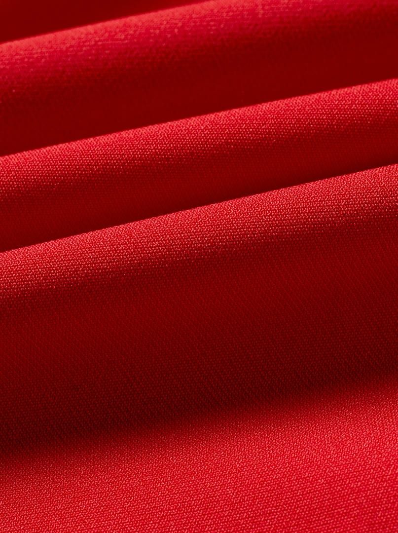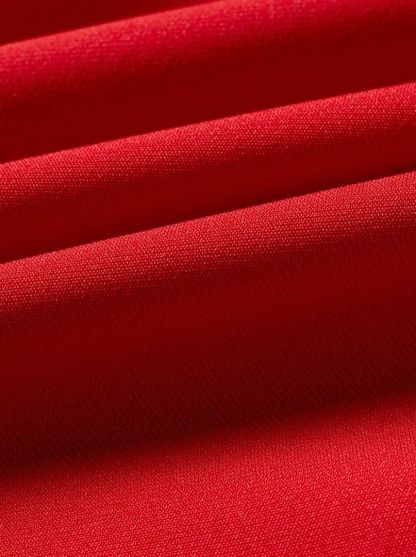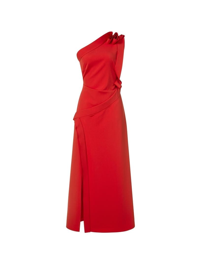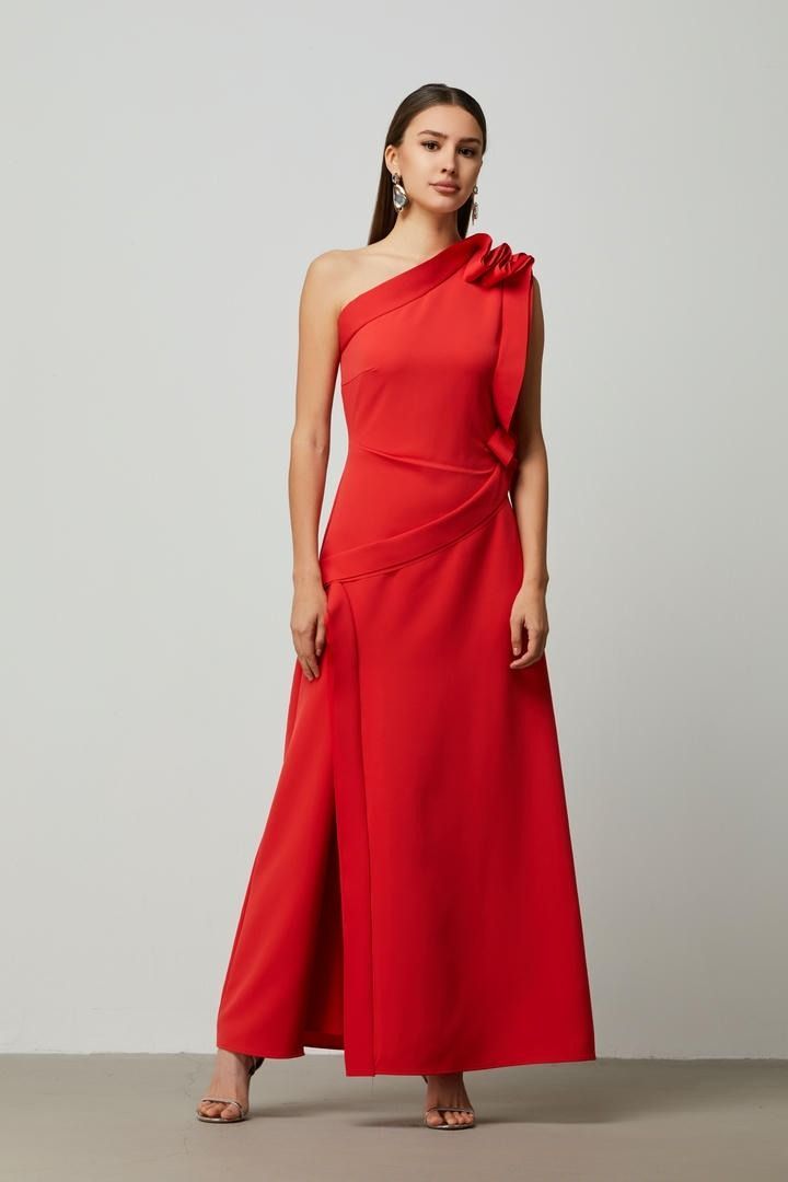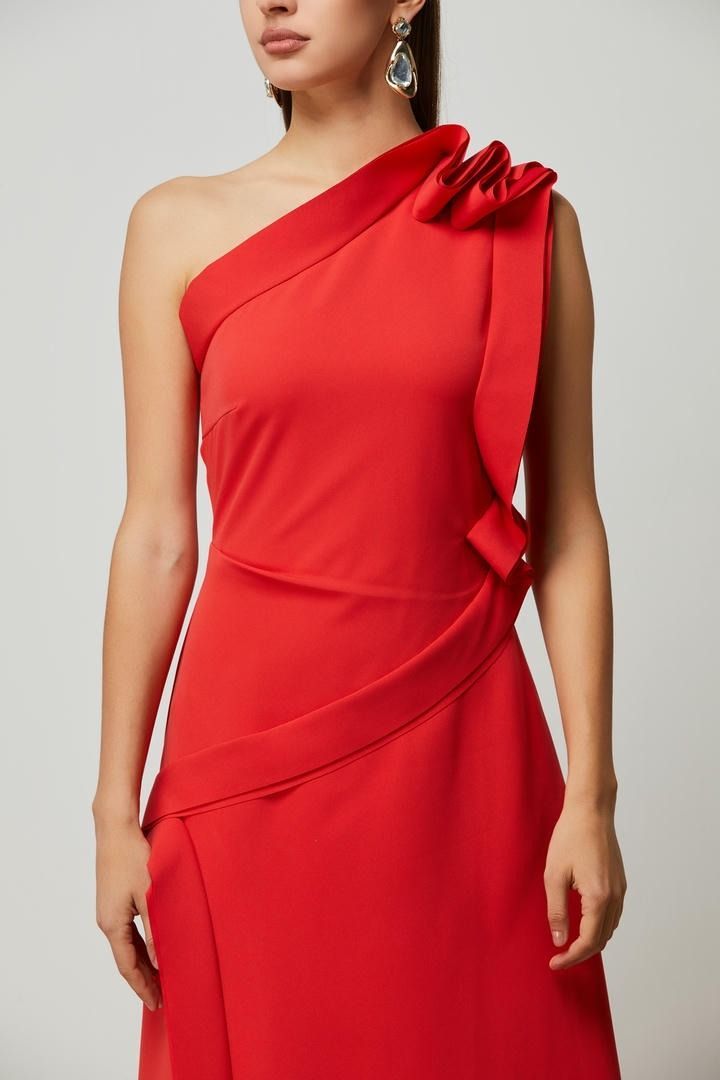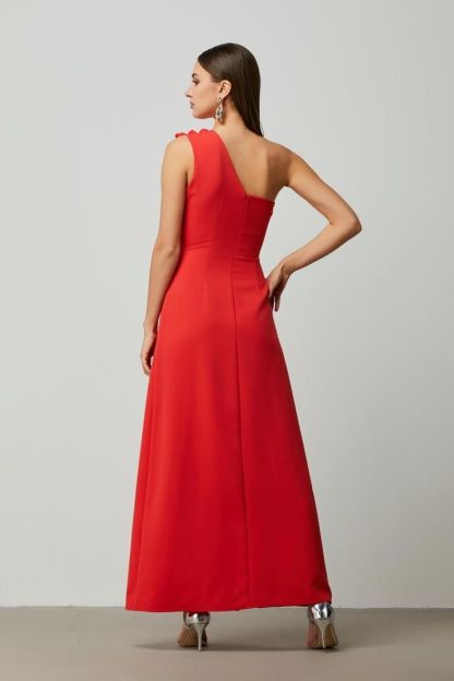 فستان أحمر جريء بتصميم كتف واحد وتفاصيل مكشكشه ثلاثية الأبعاد وقطع مائلة وشق جانبي أمامي. الطول حتى الكاحل يضيف لمسة من الأناقة، مما يجعله مثاليًا لإطلالة عيد مبهرة.