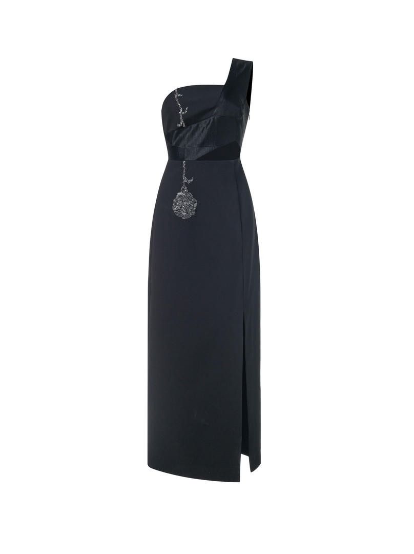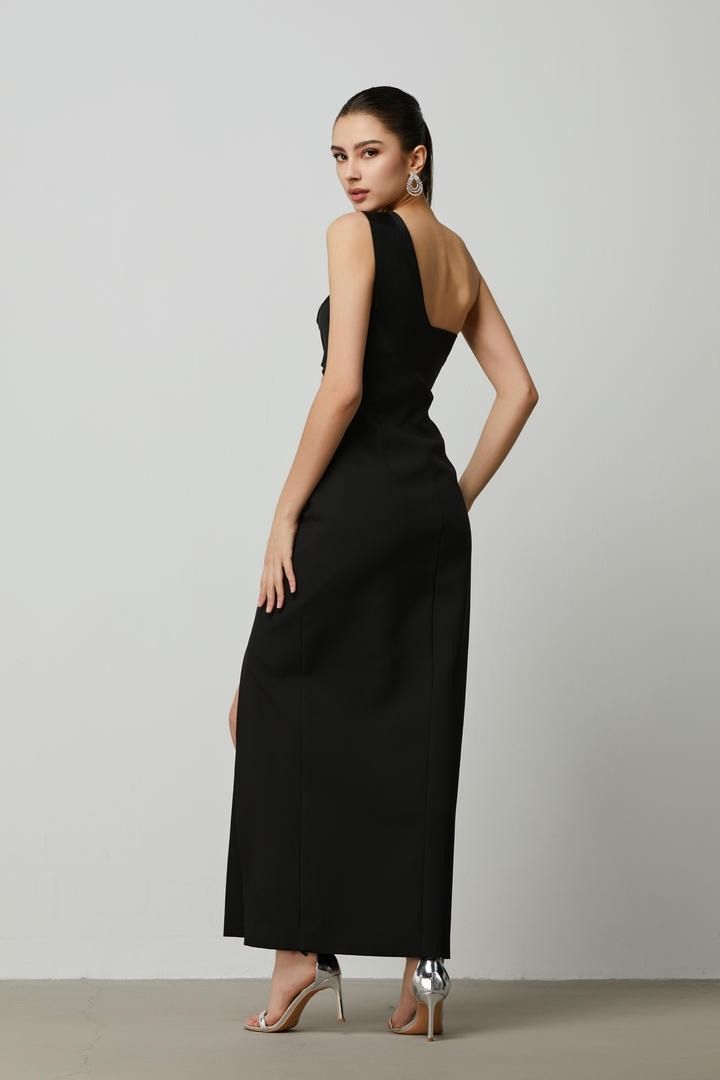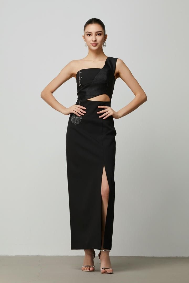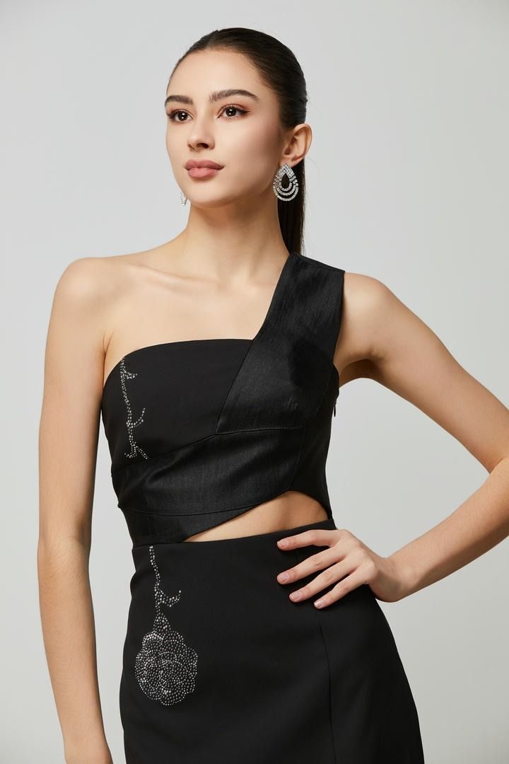 فستان أسود أنيق بتصميم كتف واحد وخصر بفتحات مميزة وتفاصيل وردة من الترتر وتنورة عمودية. مثالي لإطلالة أنيقة ومتطورة.