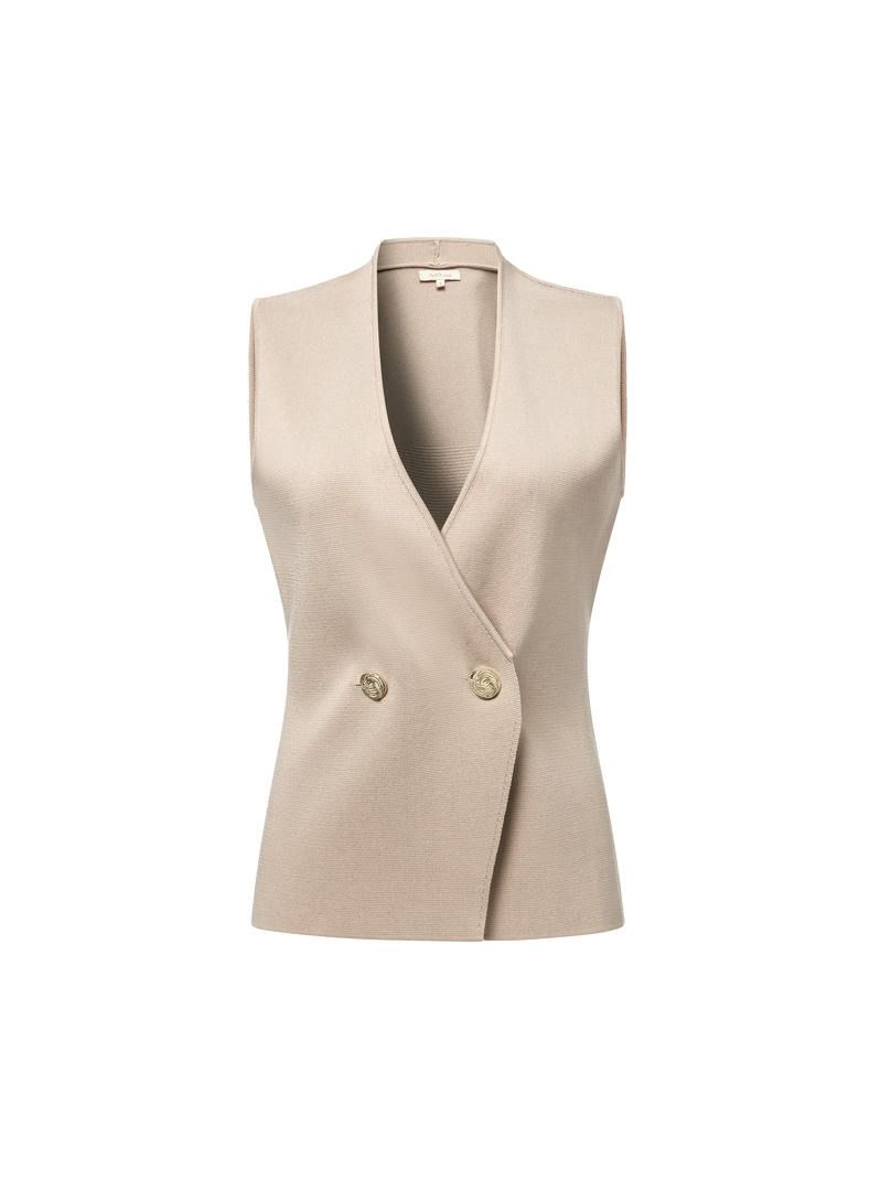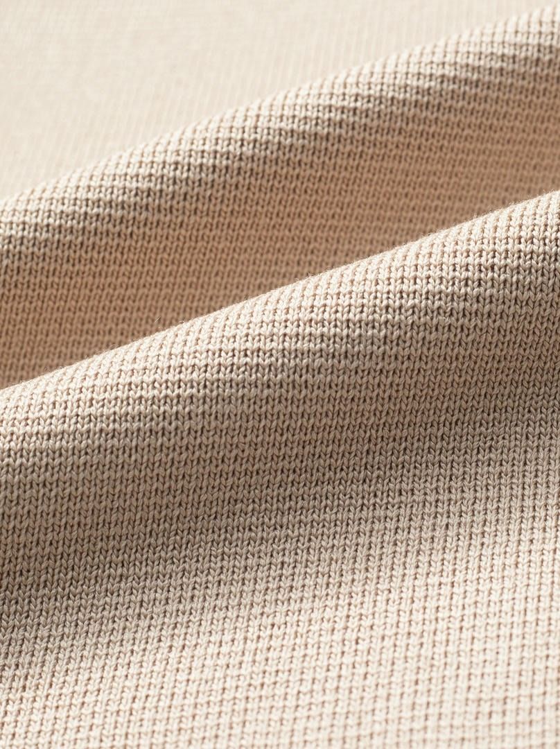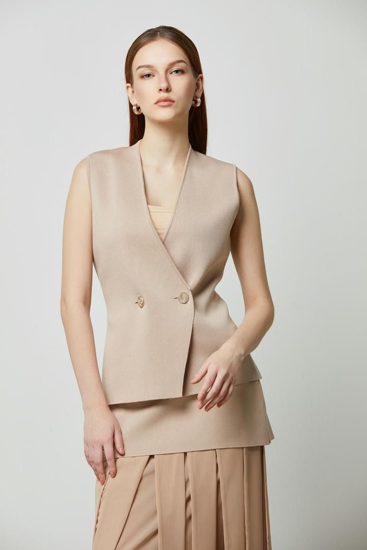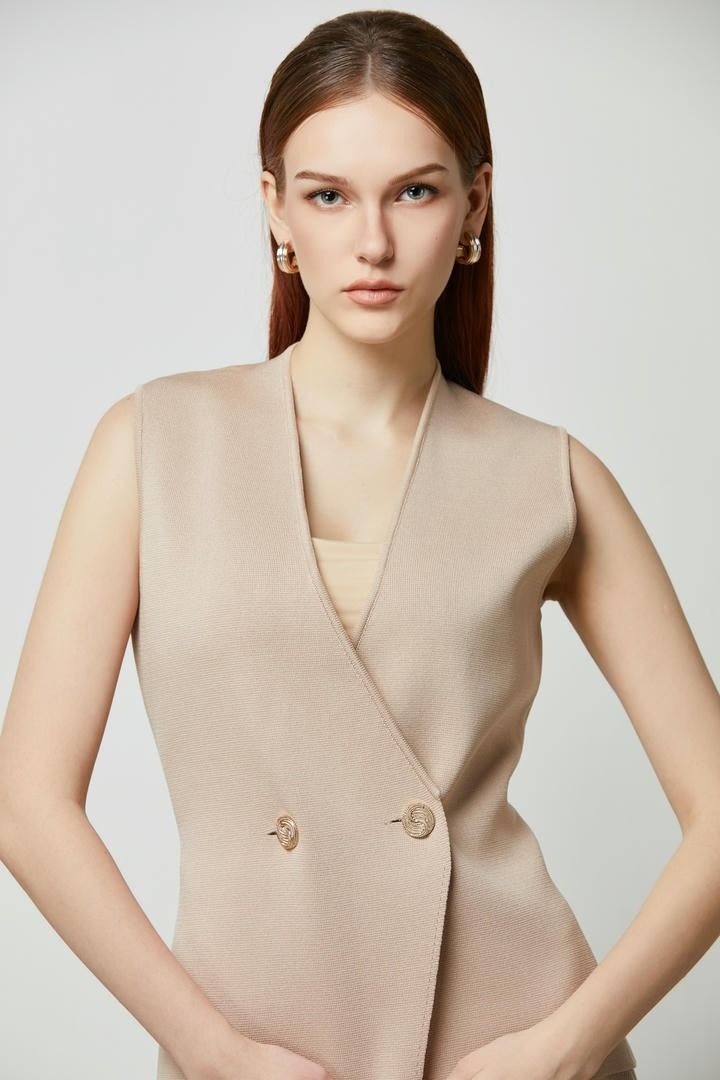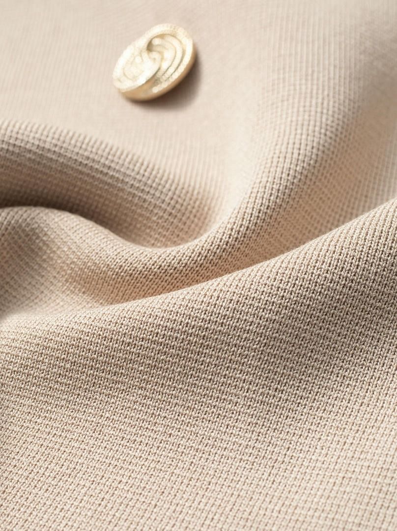 سترة متماسكة باللون الرمادي الترابي مع فتحة على شكل V وبخط إزرار. أرتديه مع تنورة من نفس المجموعة