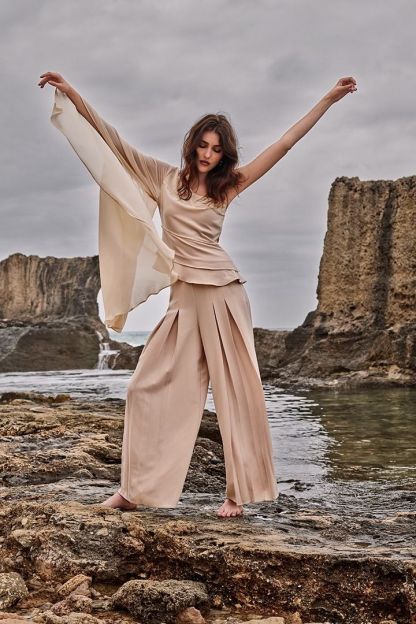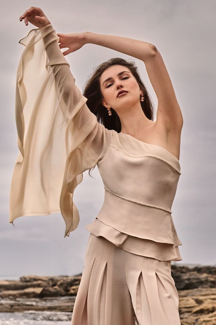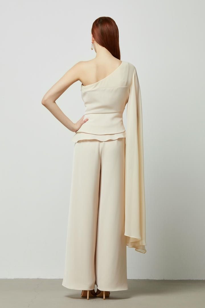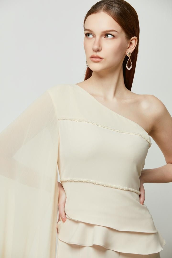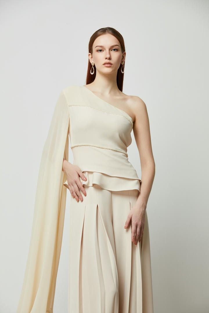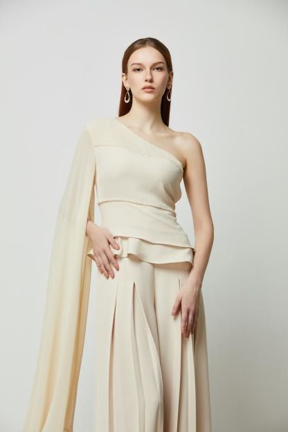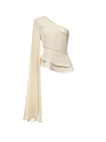 بلوزة أنيقة بكتف واحد مع كم طويل فضفاض وقصة ضيقة. مزين بتفاصيل مميزة بفتحات في المقدمة وتصميم بيبلوم غير متماثل.