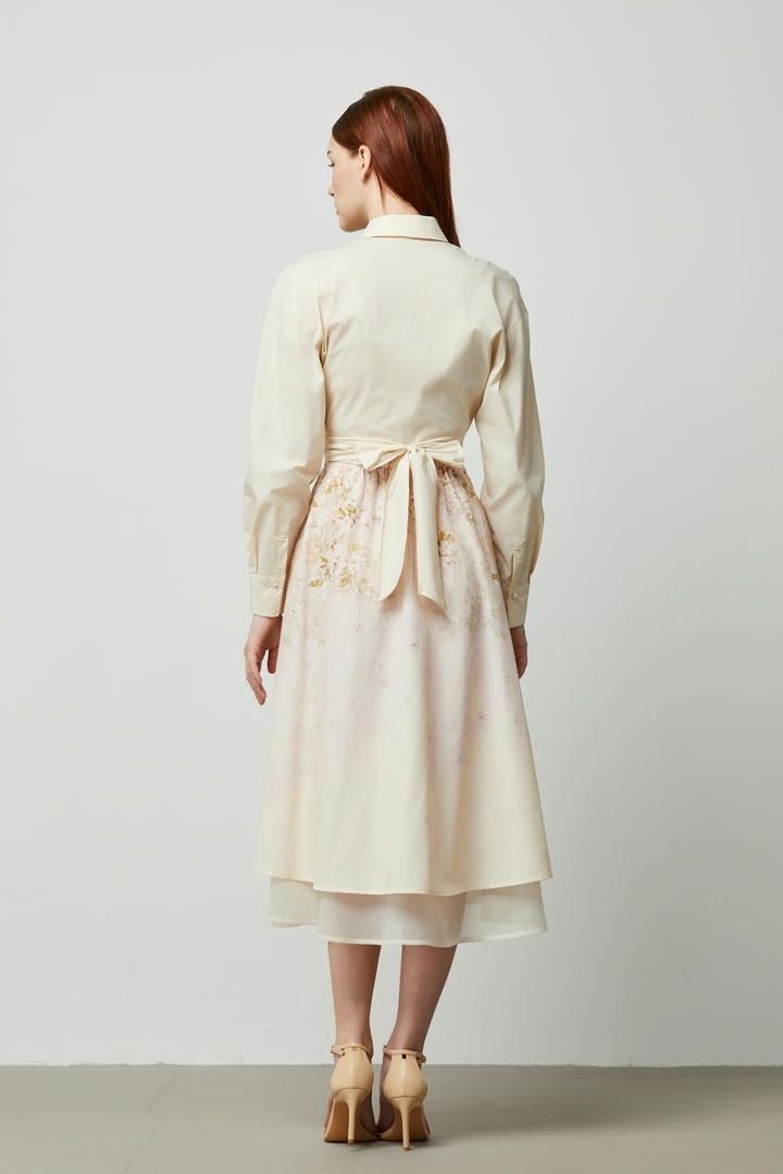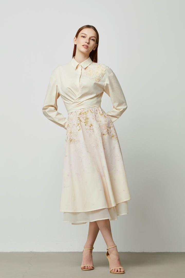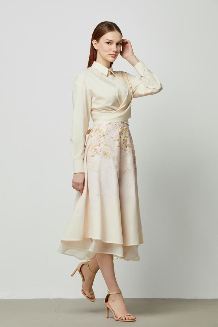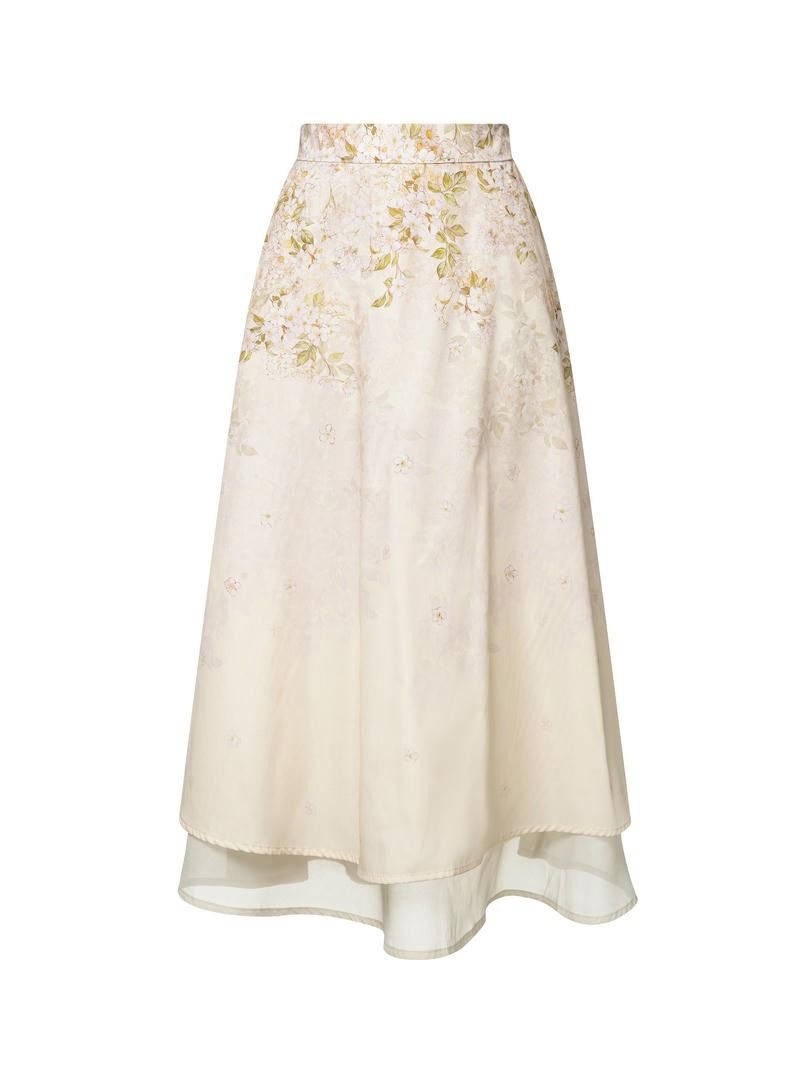 تنورة قطن وأورجانزا مرتفعة الخصر مزينة بطبعة متقنة وطبقتين بأطوال مختلفة. تحتوي على حزام خلفي مطاطي لراحة أكبر.
