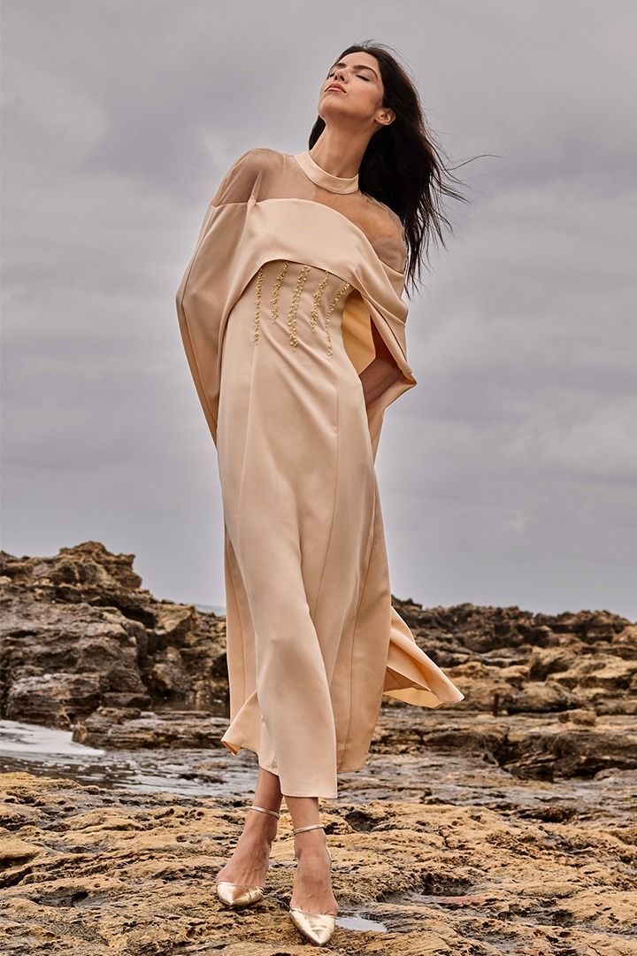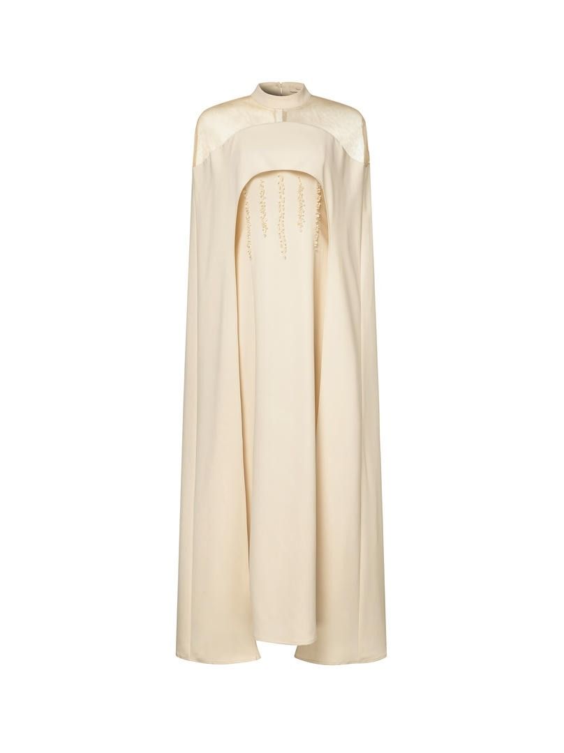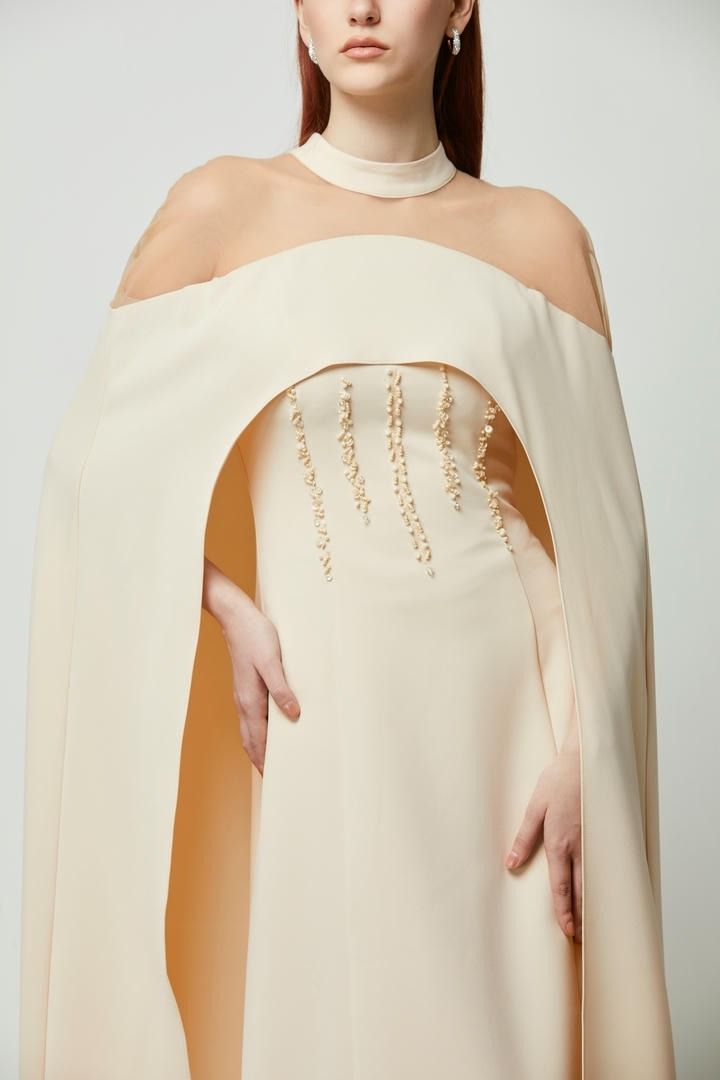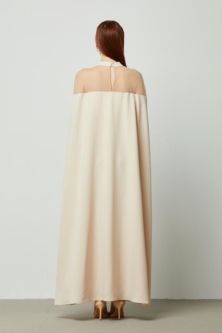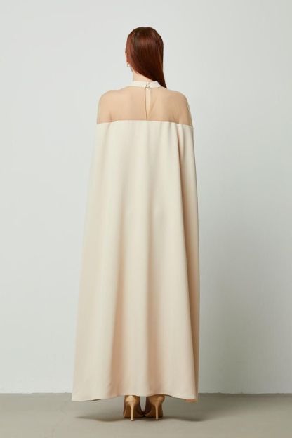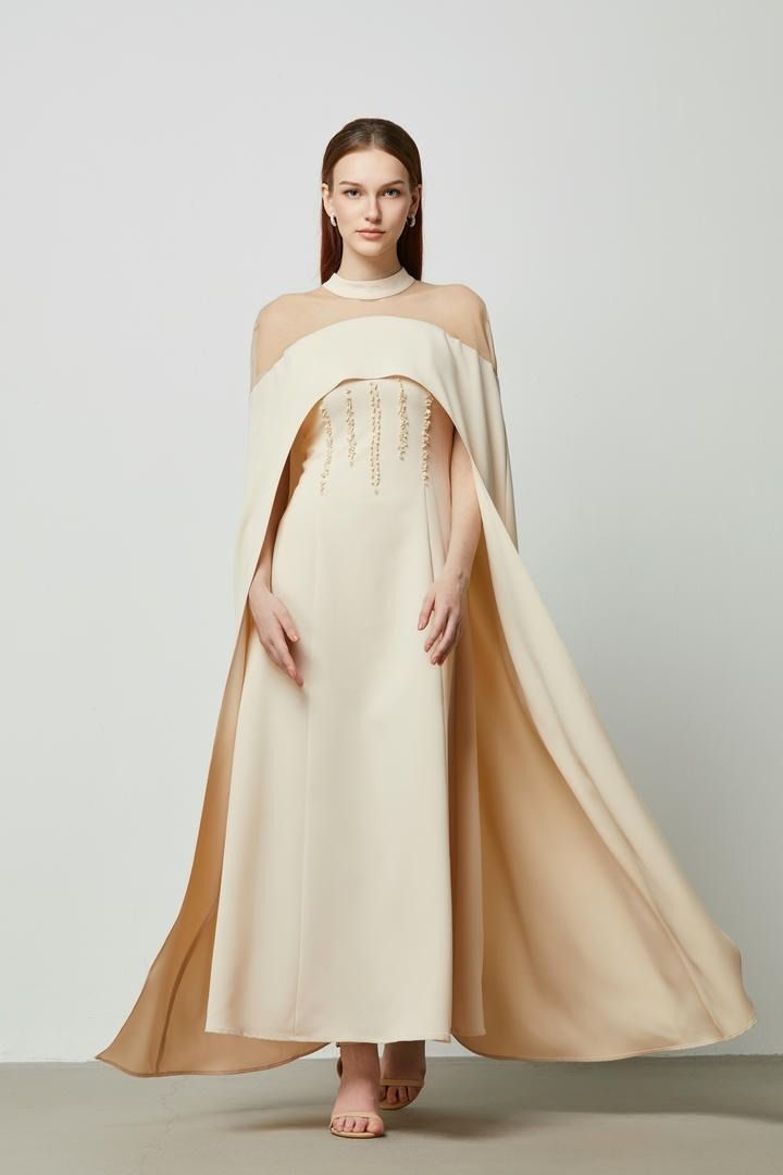 فستان طويل بعنق مرتفع وقطعة شبكية عند الأكتاف وكاب من الخلف. مزين عند الخصر لمسة فاخرة.
