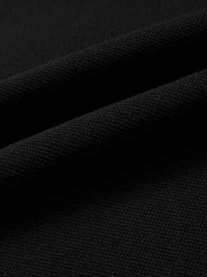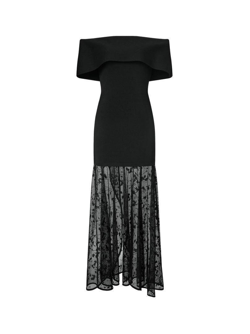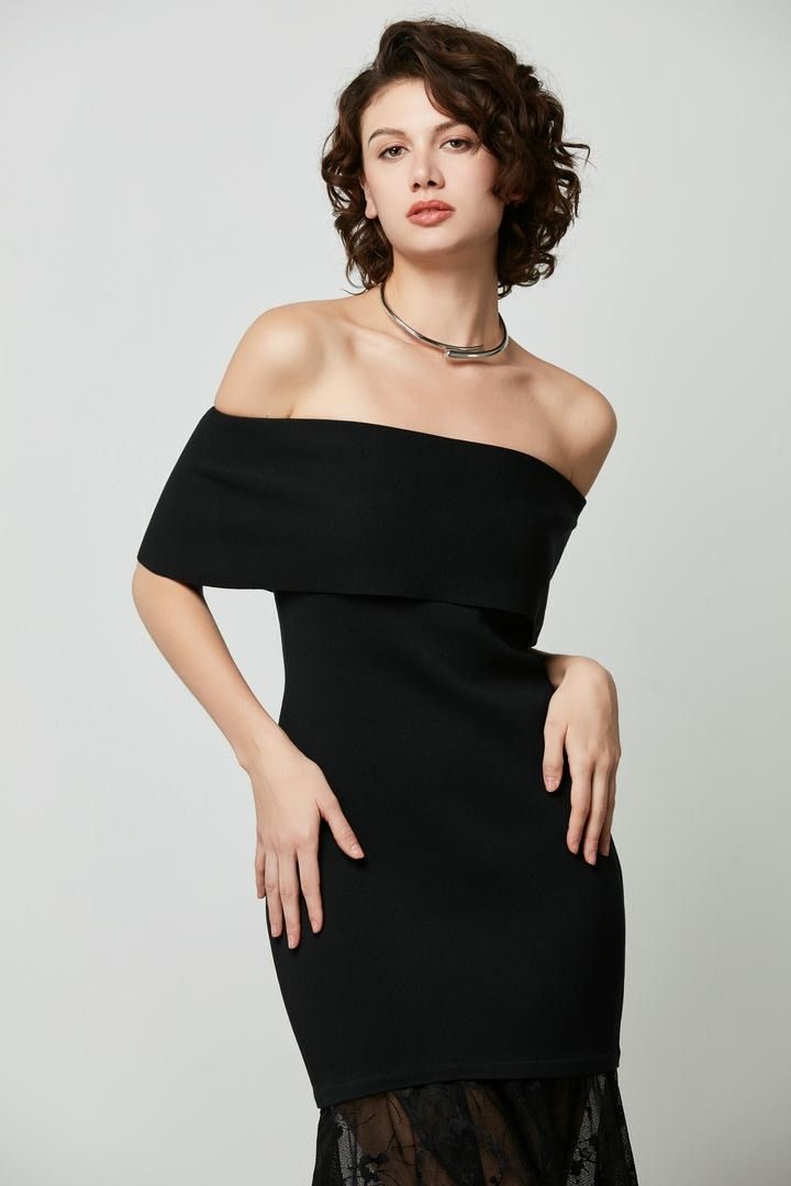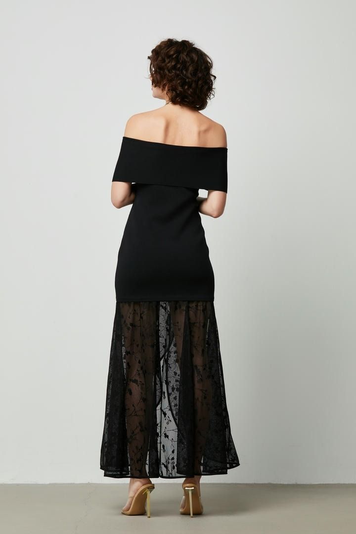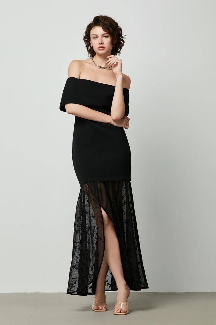 فستان ضيق أسود بتصميم كتف مكشوف وصدرية ضيقة وطبقة من الدانتيل الشفاف في الأسفل. إطلالة مثالية.