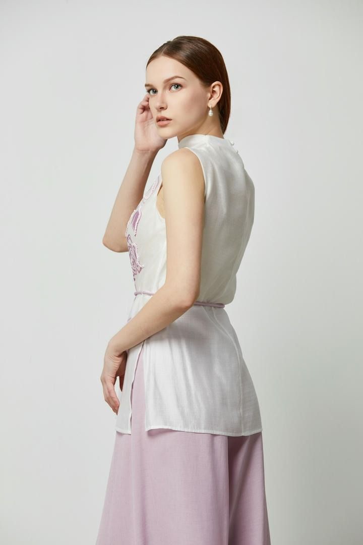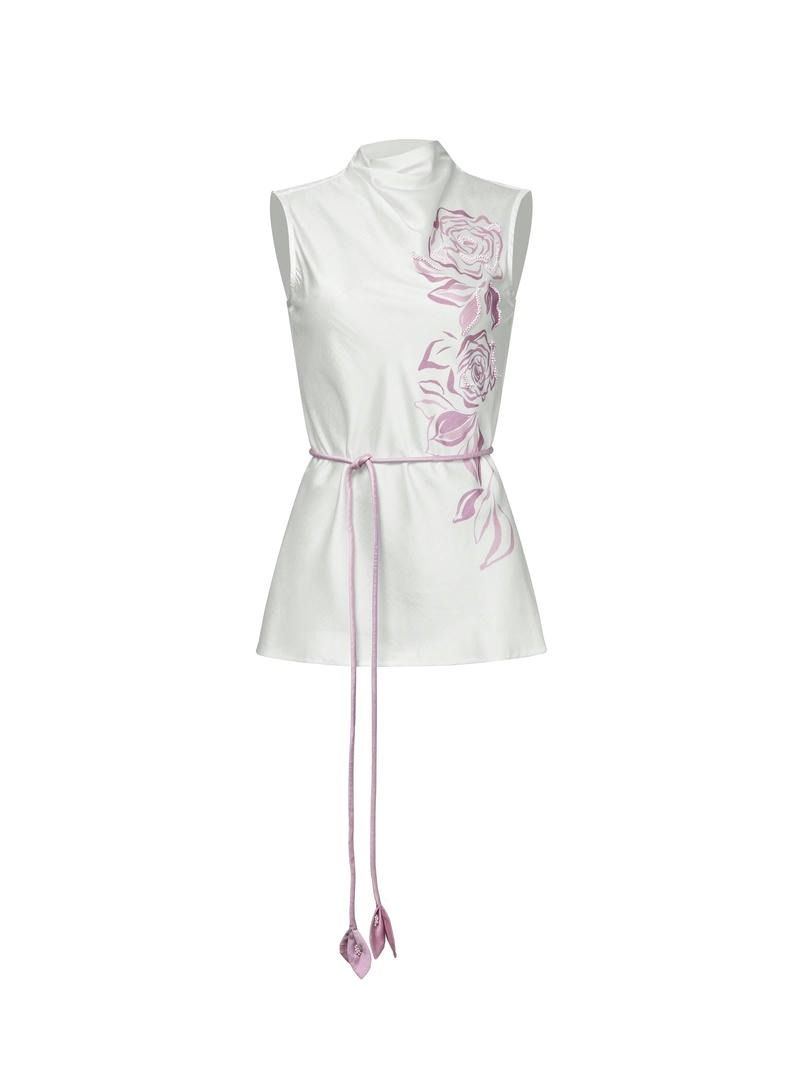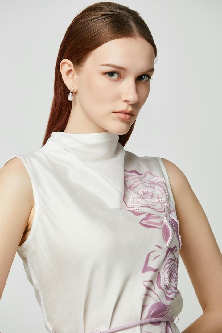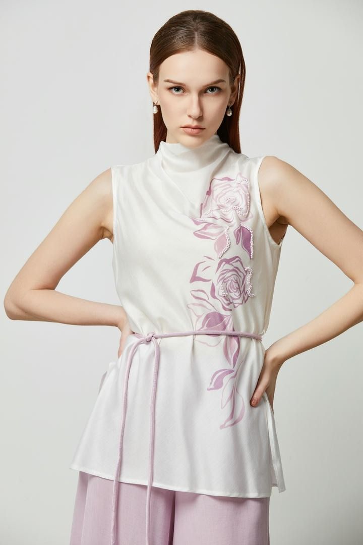 تتميز البلوزة المصممة من الكريب بطبعات مختلطة بجانب واحد وياقة واقفة مكشكشه. ومن أبرز قطعها حزام حبل مزخرف.