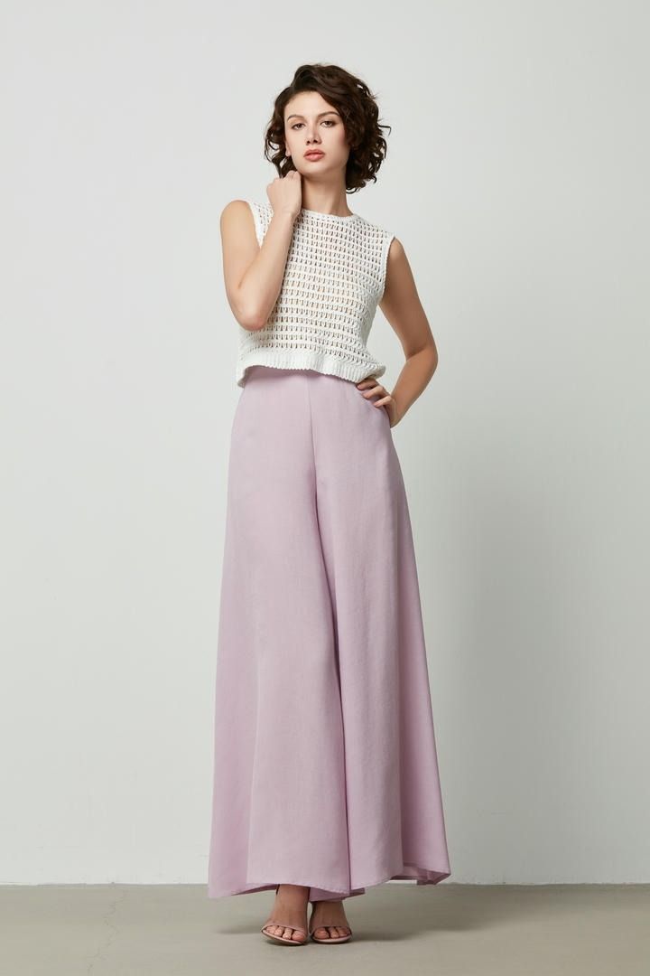 بنطال كريب بلون الأرجواني بخصر مرتفع وسحاب جانبي. يتميز بقصة واسعة مموجة