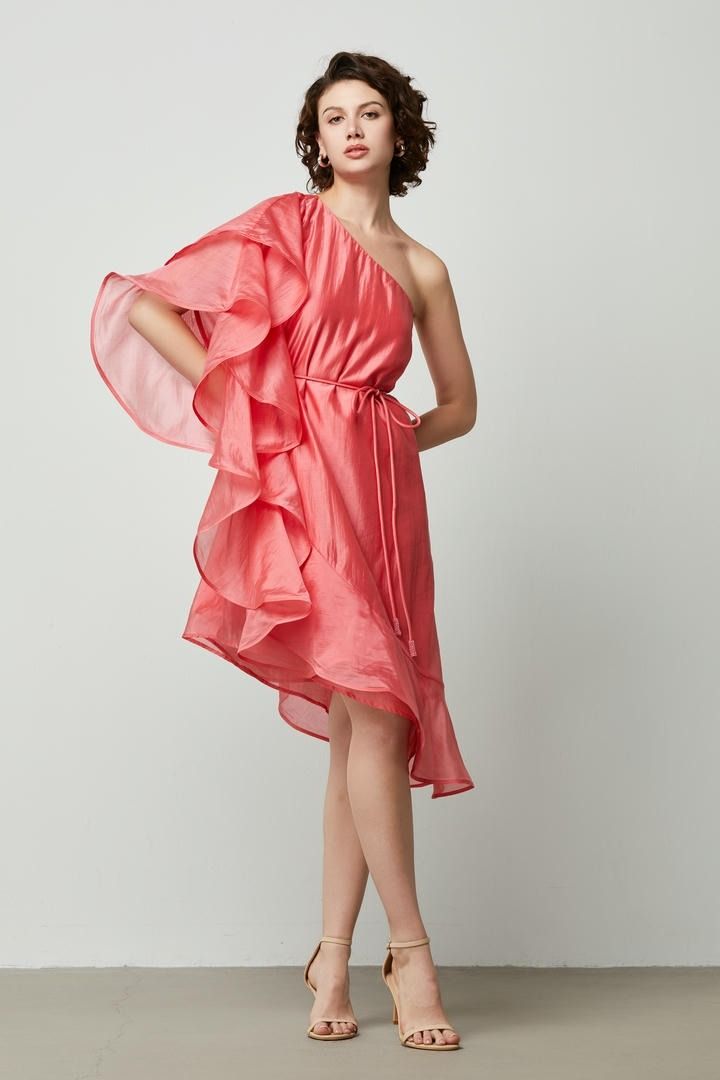 فستان بكتف واحد بتفصيلات مكشكشه