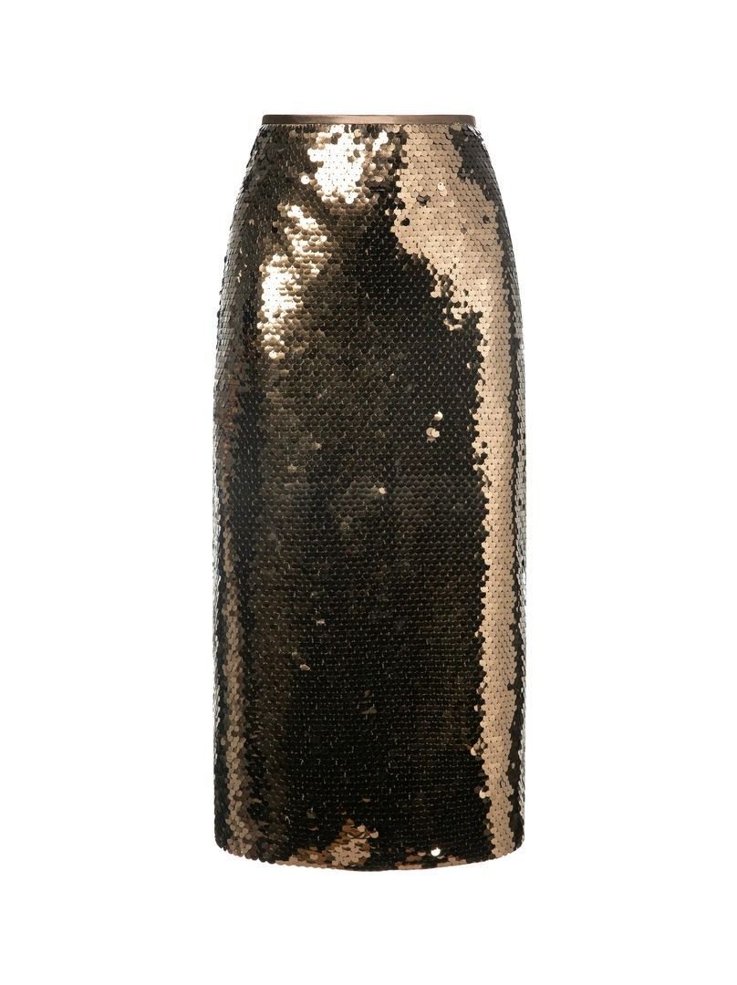 تنورة ميدي بخصر عالٍ وقصة قلم رصاص أنيقة، تتميز بشق جانبي وطبقة خارجية من الترتر اللامع. مزودة بسحاب جانبي مخفي لإطلالة سلسة.