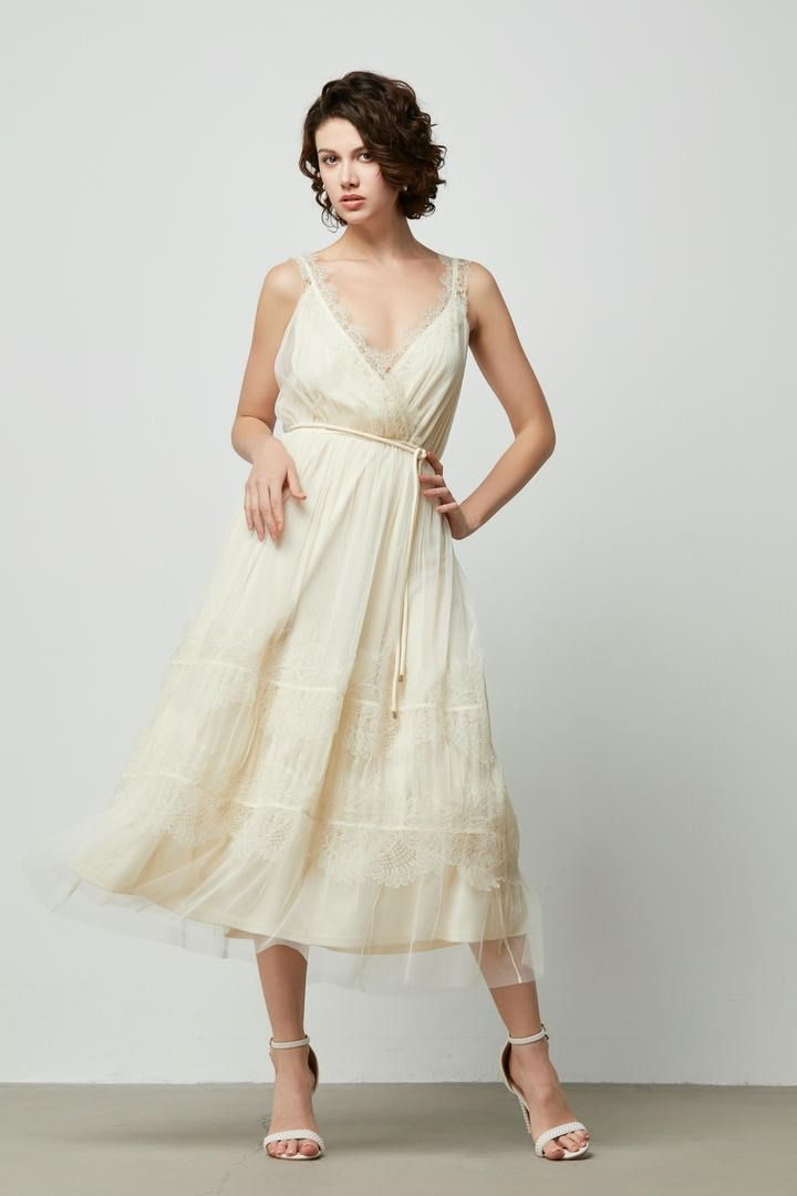فستان ميدي بدون أكمام من قماش الشيفون الشفاف بلون البيج، مزين بتطريز الدانتيل الرقيق وطيات أنيقة. يُكمل إطلالتك بحزام من الحبل لإضفاء لمسة عصرية مريحة