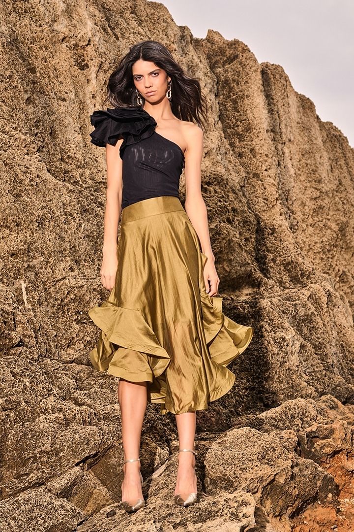 تنورة ميدي بخصر مرتفع مصممة لإطلالة مميزة بتموجات جريئة وجذابة تتدفق برشاقة على طولها. سحاب خلفي أنيق يضفي لمسة نهائية متناسقة ويسهل ارتداؤها.