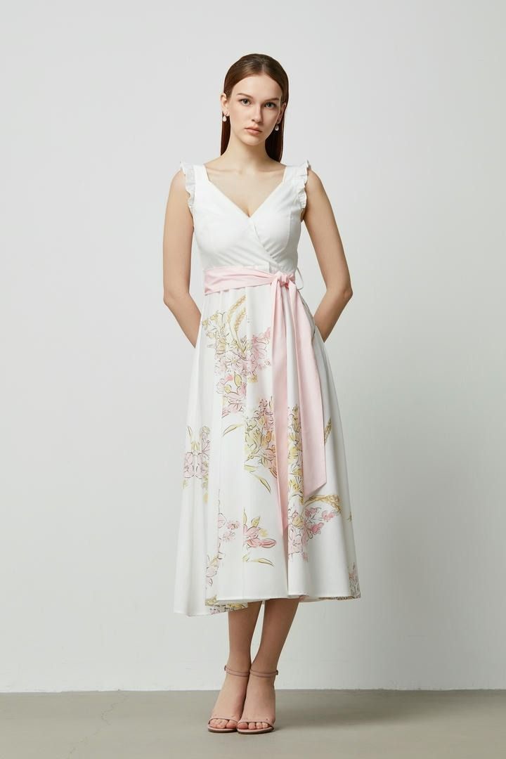 فستان قطني جذاب بتصميم طباعة مميز، مع حمالات مكشكشه أنثوية وحزام قابل للنزع لتنسيقات متعددة—إطلالة مثالية تمنحك أناقة مريحة مع لمسة شخصية