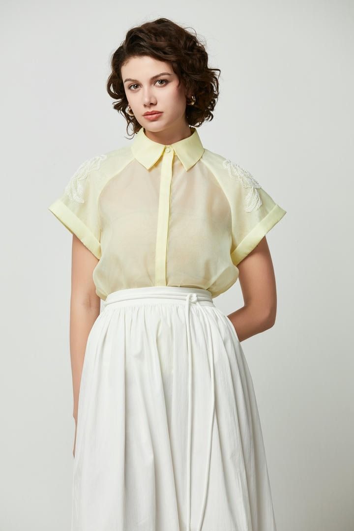 قميص أورجانزا أصفر مع زخارف زهرية عند الكتف بأكمام قصيرة و خط إزرار أمامي مخفي