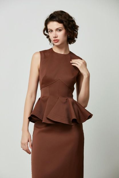 بلوزة ساتان مات باللون البني بدون أكمام مع بيبلوم جريء وقصة ضيقة. أرتديه مع تنورة من نفس المجموعة
