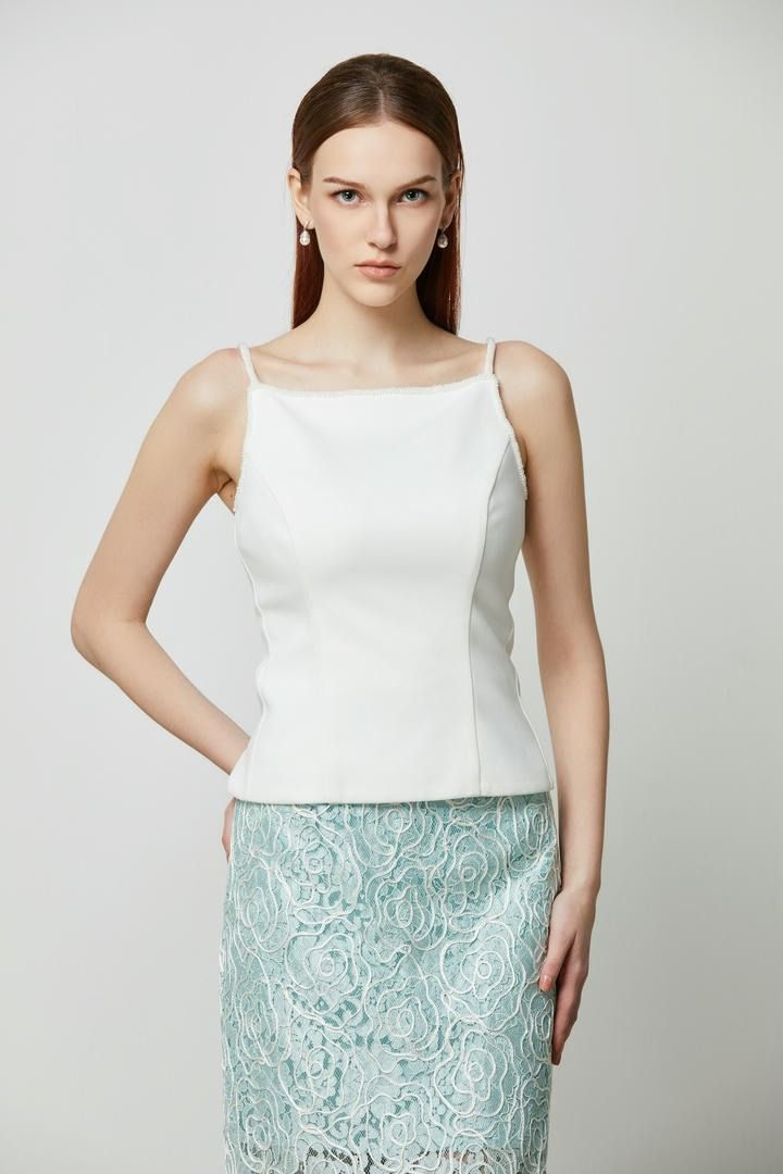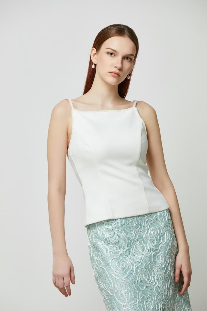 بلوزة بفتحة عنق مربعة، قصة ضيقة، حمالات مزينة بالخرز على الكتف وسحاب خلفي.