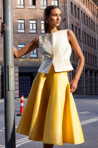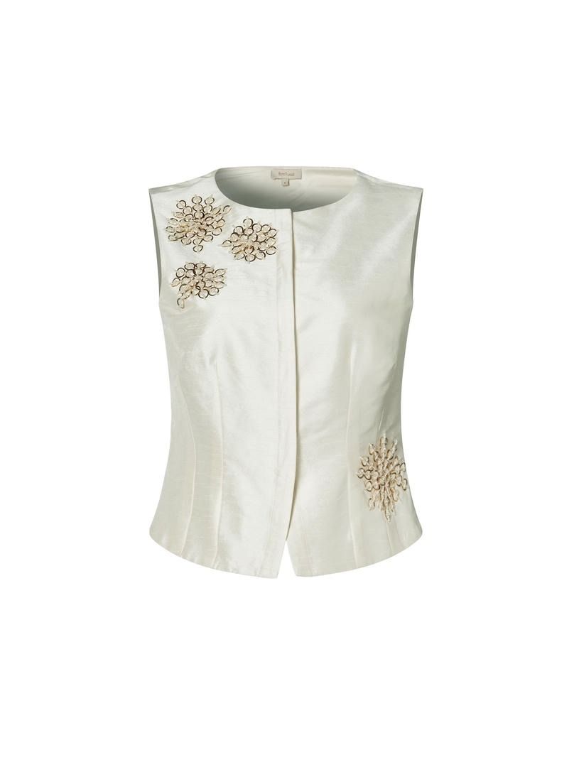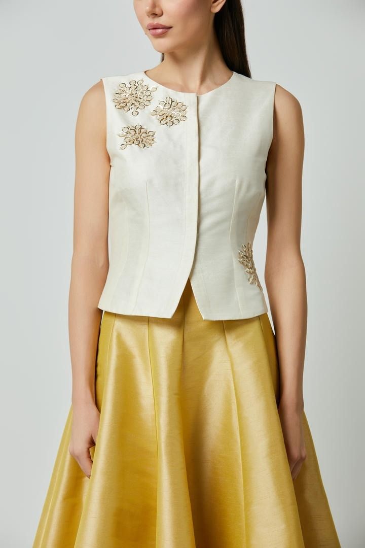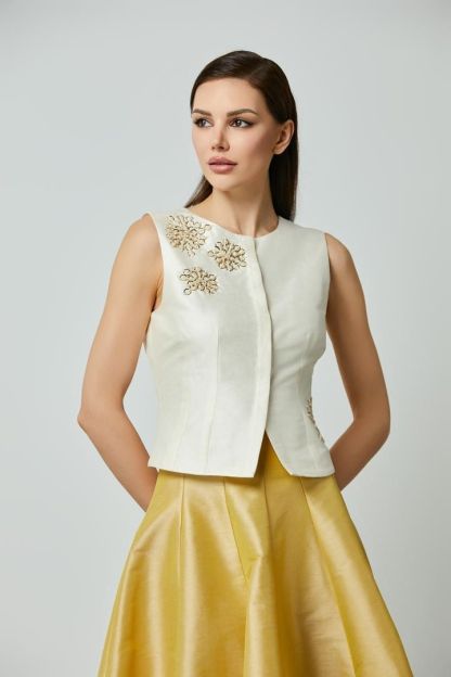 بلوزة أنيقة تتميز بياقة دائرية وسحّاب مخفي لتصميم متناسق. مزينة بتطريز فاخر على الجزء الأمامي، مما يضفي لمسة من الأناقة والفخامة.