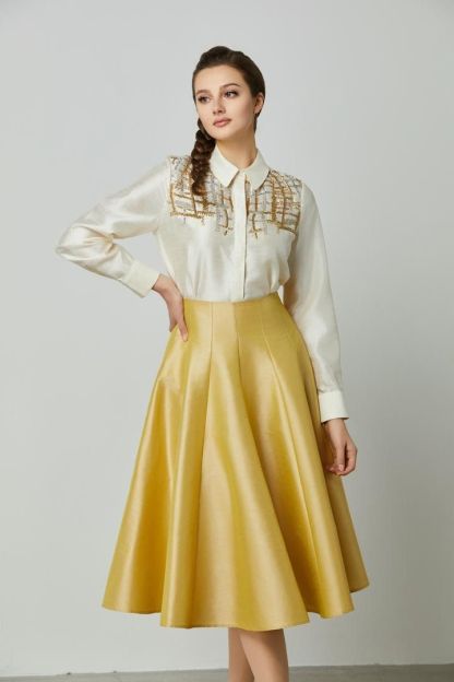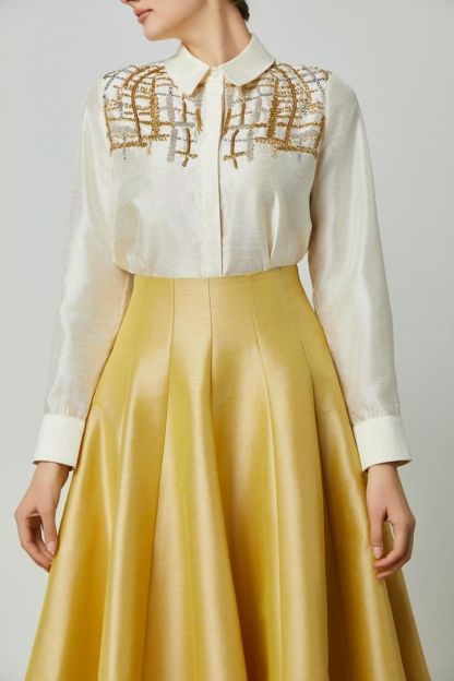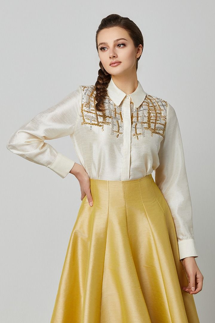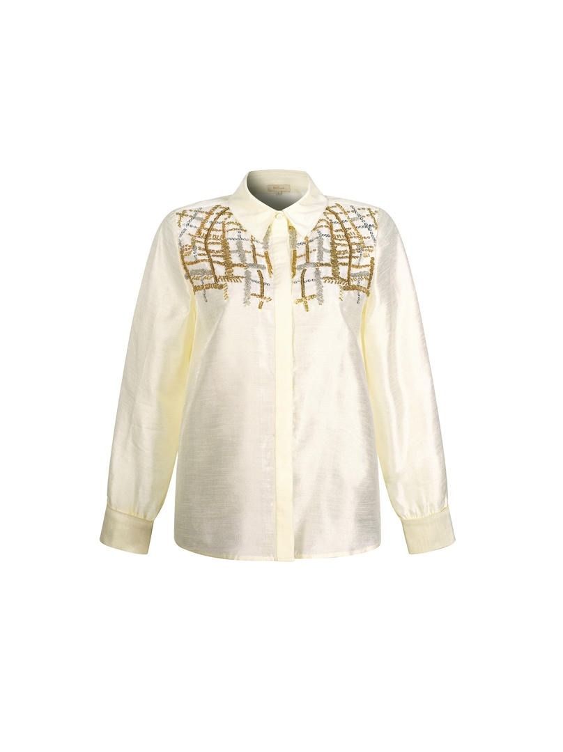قميص أنيق يتميز بياقة كلاسيكية، وقصة واسعة لإطلالة مريحة. يضيف الإغلاق المخفي لمسة انسيابية، بينما يعزز التطريز الغني على الكتف التصميم بجاذبية فاخرة.