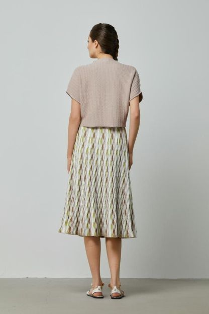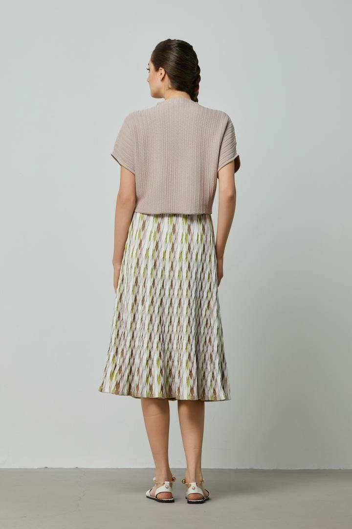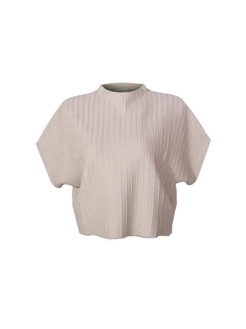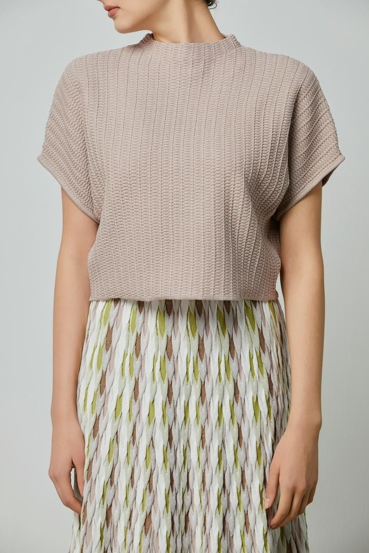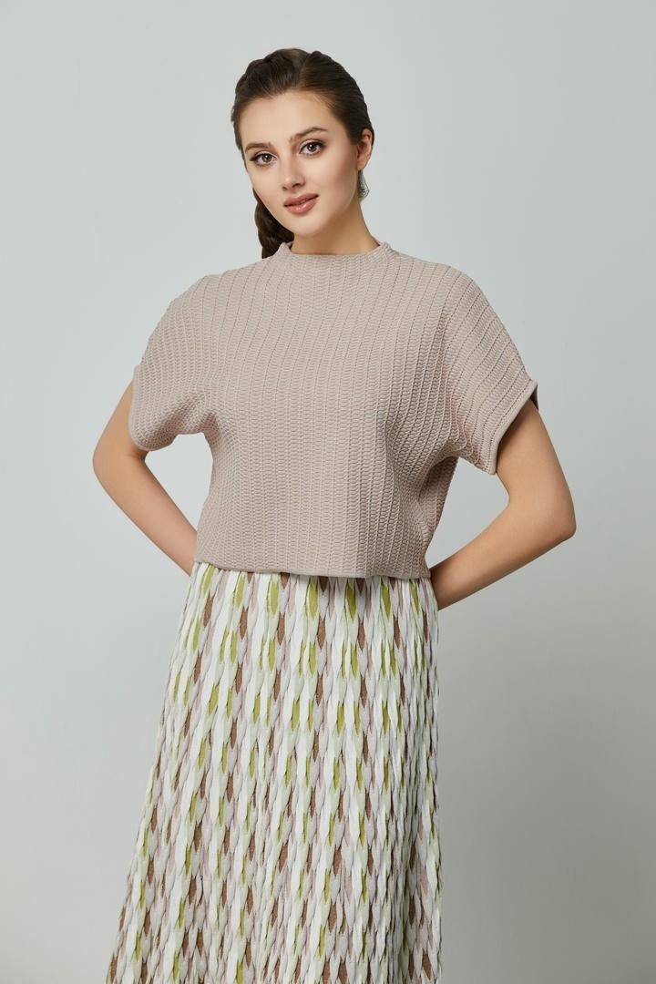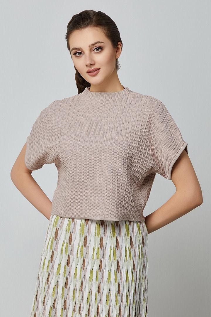 بلوزة عصرية تتميز بياقة مرتفعة وأكمام منسدلة مع قصة واسعة لإطلالة حديثة. تضيف القصّة القصيرة والنمط المحبوك الخاص لمسة فريدة وعصرية للتصميم.