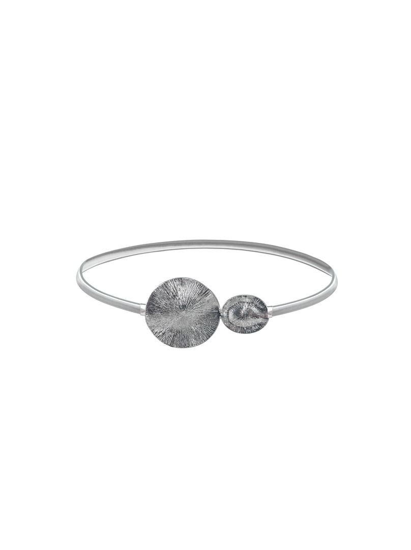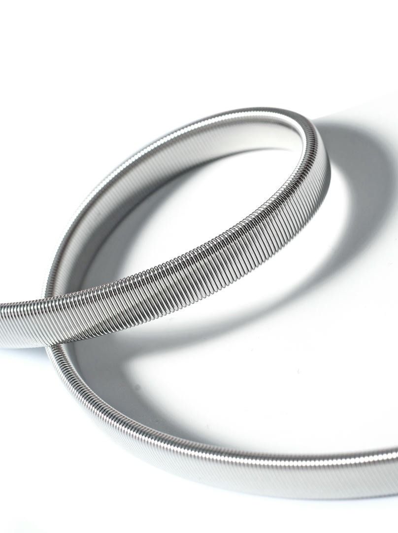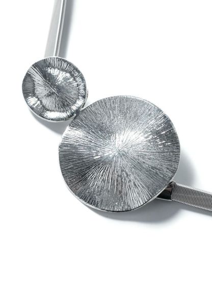 Textured metal design on the round buckle attached to the elastic belt in a silver tone.