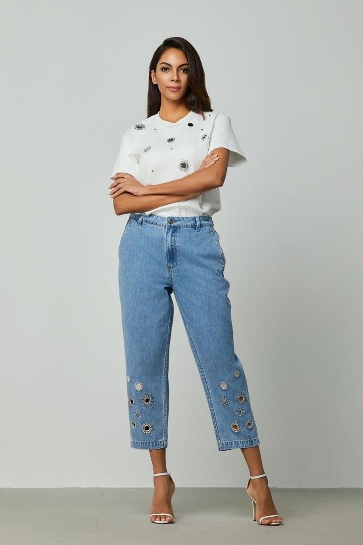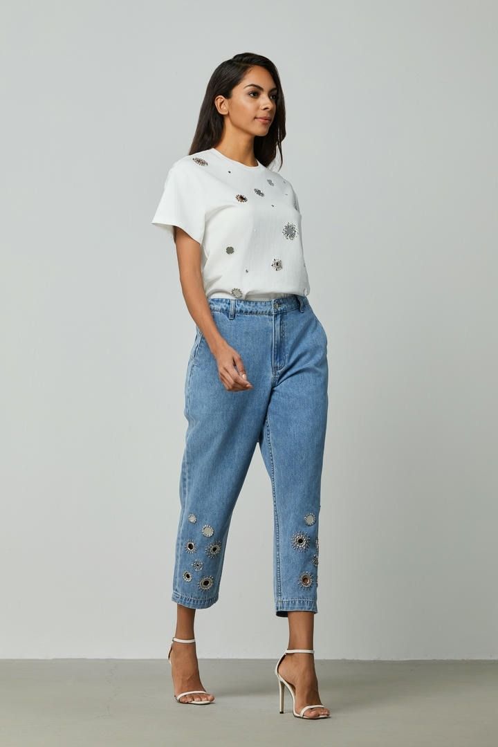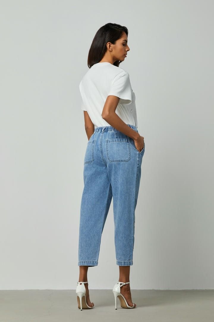 يتميز هذا الجينز بخصر مطاطي من الخلف لراحة إضافية، وتصميم علوي واسع، مع تفاصيل فتحات مزينة بالخرز عند الحافة السفلية.