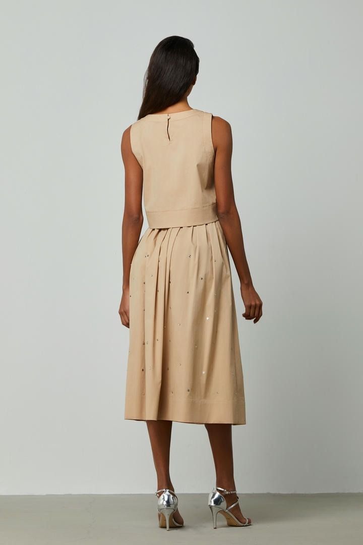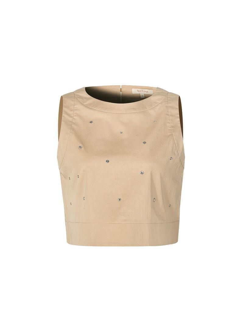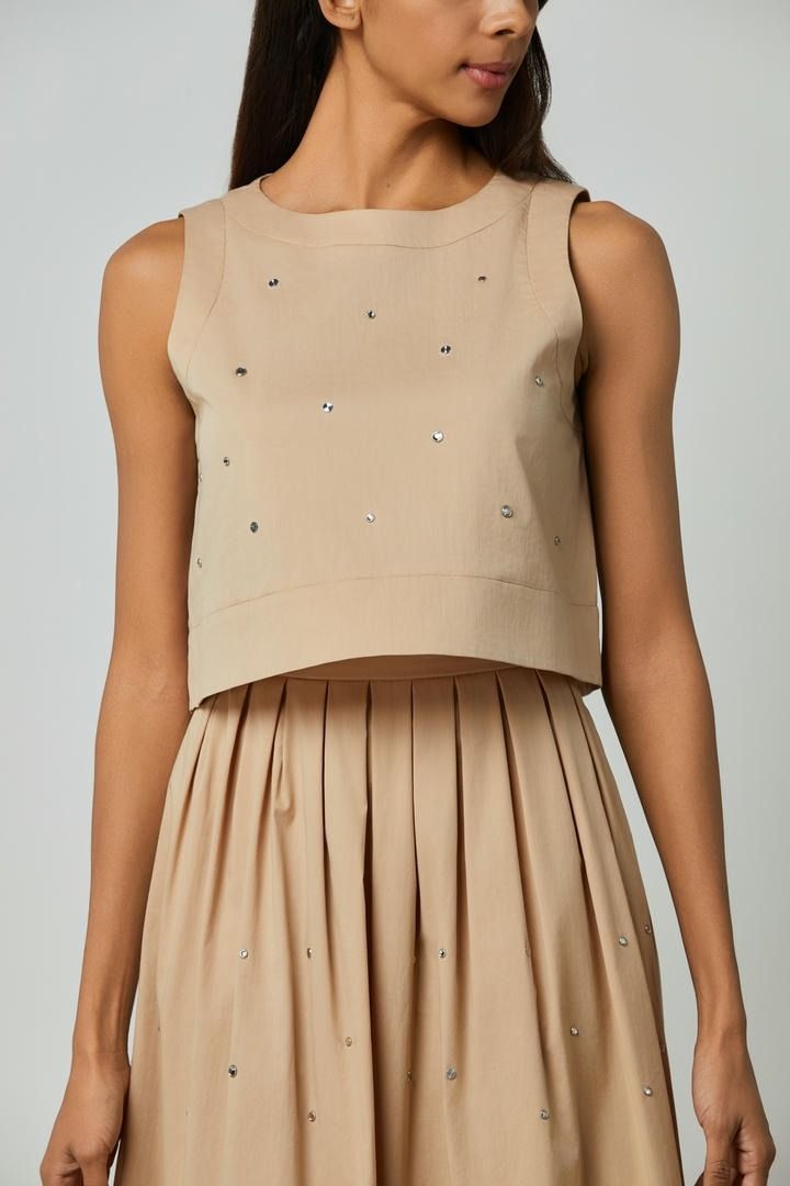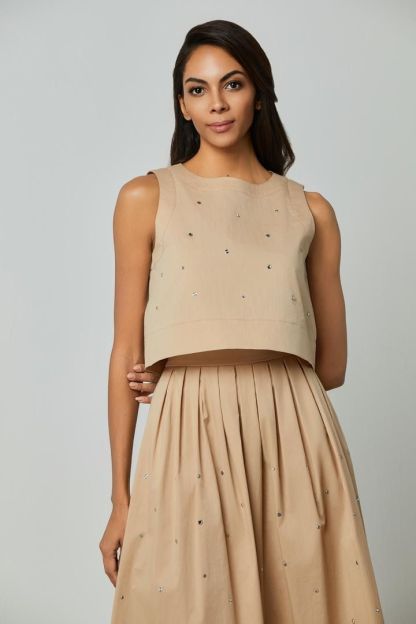 هذا بلوزة بدون أكمام مع ياقة دائرية يتميز بتفاصيل زخرفية أنيقة تضيف لمسة من الرقي. نسقيه مع التنورة المطابقة لإطلالة متكاملة.