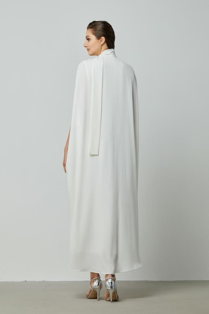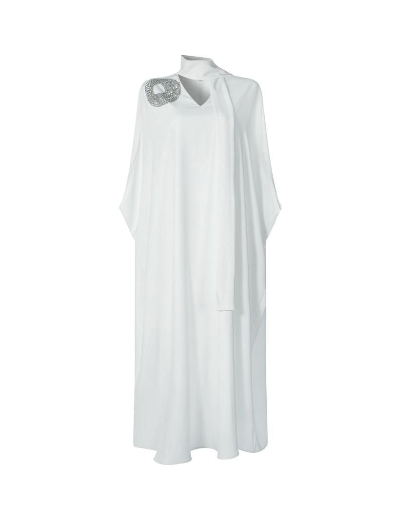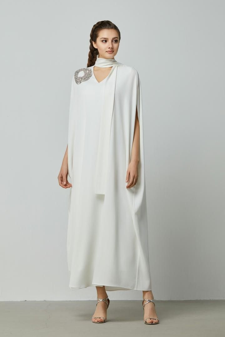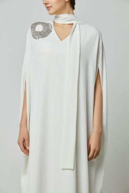 يتميز هذا القفطان الأنيق بياقة على شكل V وشال متصل من منتصف الظهر، مع تصميم واسع وجوانب مستقيمة. تُزينه تطريزات خرزيه دقيقة تضيف لمسة من الفخامة الكلاسيكية.