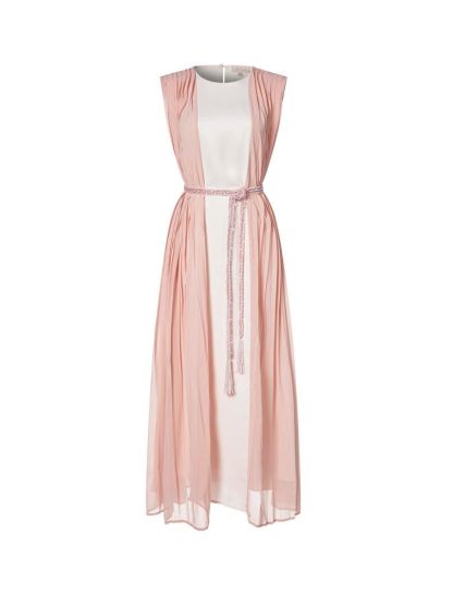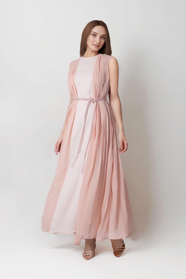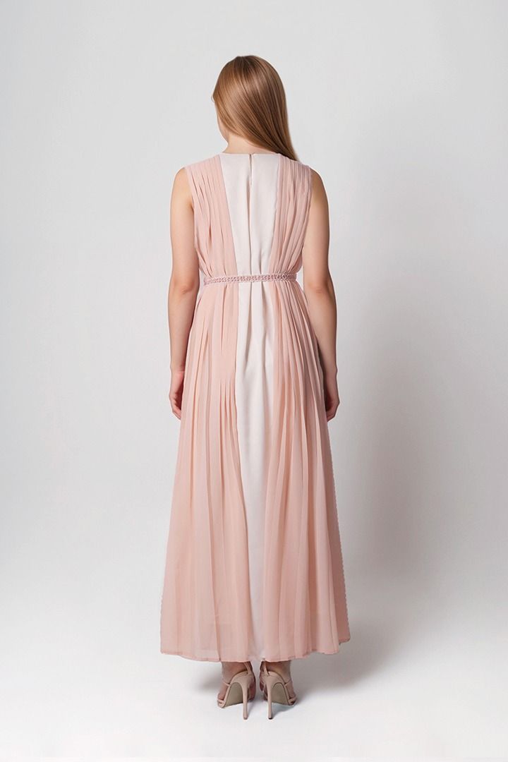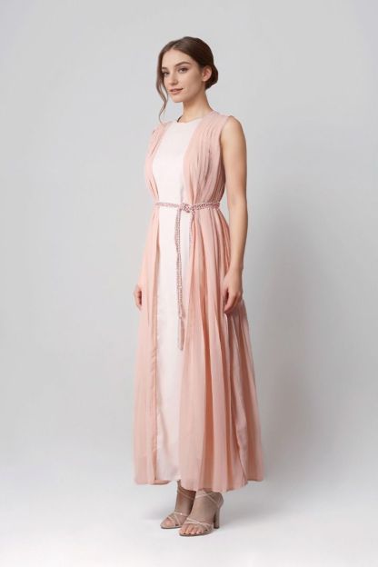 يتميز هذا القفطان الطويل بدون أكمام بياقة دائرية ,ونمط طيات من الجنب، مع حزام مطرز لإطلالة أنيقة وبطانة كاملة لمزيد من الراحة.