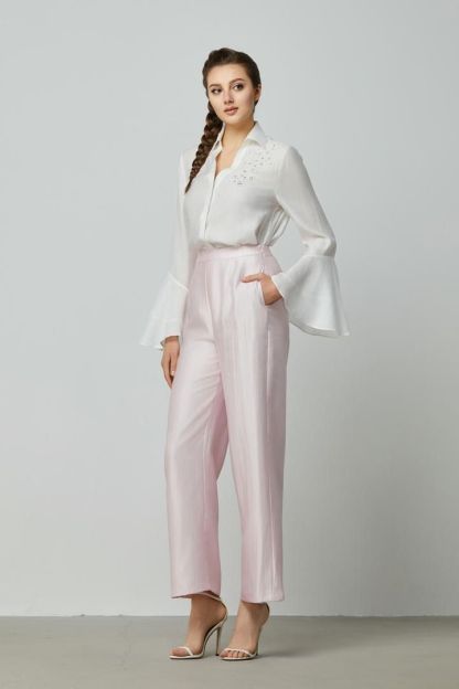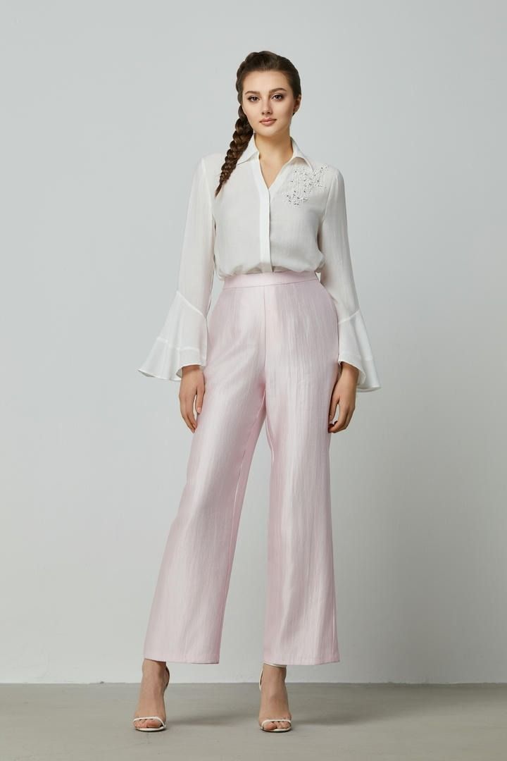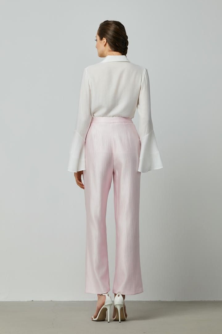 تتميز هذه البنطلونات بخصر عالي وأرجل واسعة، مع تفاصيل سحاب مخفي للحصول على مظهر أنيق وجذاب.