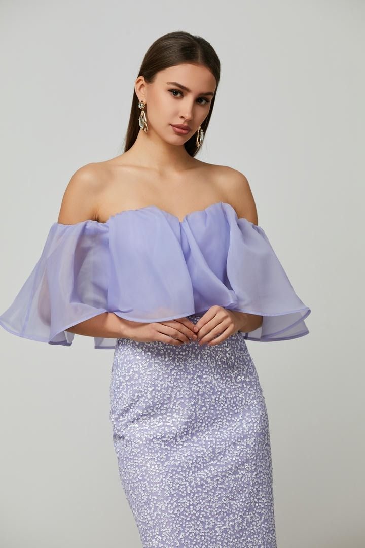 توب كورسيه بدون حمالاتمن الأورجانزا البنفسجية الفاخرة. يتميز بتصميم مكشوف الكتفين مع كشكش فخم يمنح إطلالة حالمة ورومانسية. مزود بسحاب في منتصف الظهر لضمان ملاءمة مثالية. يمكن تنسيقه مع تنورة من نفس المجموعة لإطلالة متكاملة وجذابة.